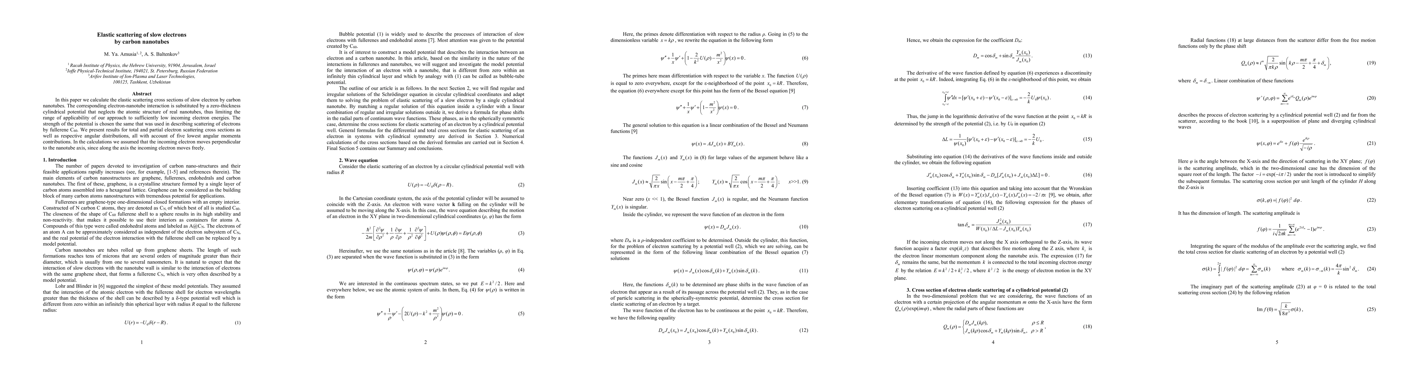 The paper presents general formulas for elastic scattering cross sections of slow electrons by cylindrical potential wells, derived using Bessel functions and phase shifts.