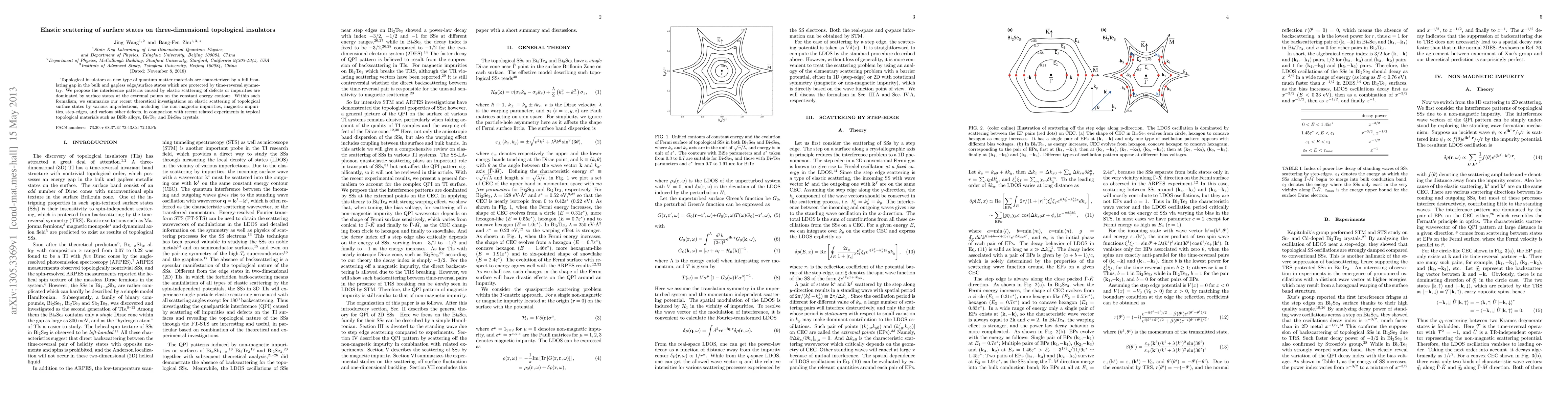 This paper investigates the elastic scattering of topological surface states in three-dimensional topological insulators, focusing on interference patterns caused by defects and impurities. Theoretical findings on scattering by various imperfections are compared with experimental results in materials like BiSb alloys and Bi$_2$Te$_3$ crystals.