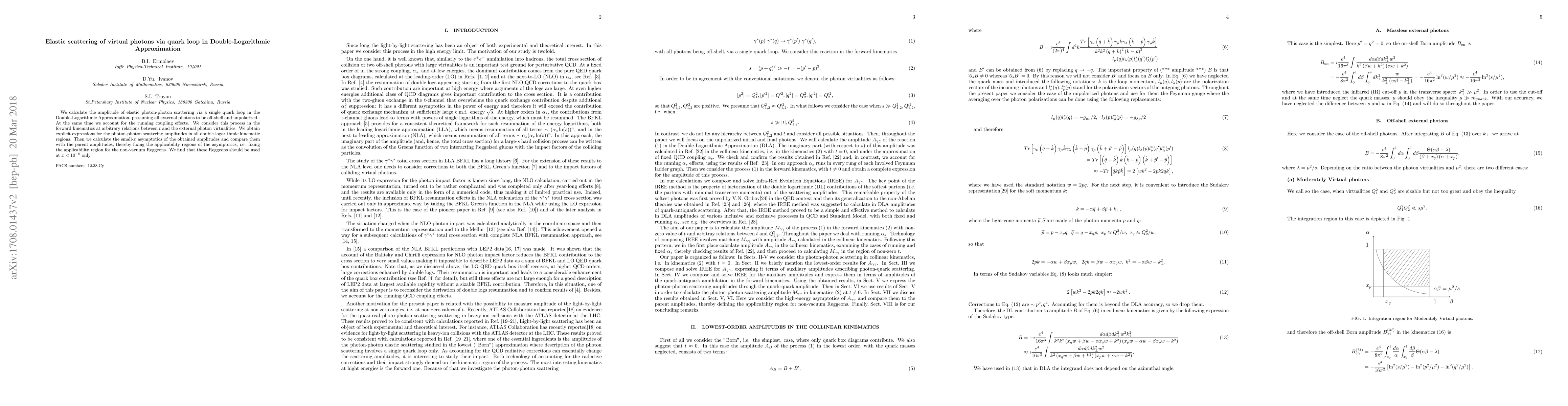 We calculate the amplitude of elastic photon-photon scattering via a single quark loop in the Double-Logarithmic Approximation, presuming all external photons to be off-shell and unpolarized.. At the same time we account for the running coupling effects. We consider this process in the forward kinematics at arbitrary relations between t and the external photon virtualities. We obtain explicit expressions for the photon-photon scattering amplitudes in all double-logarithmic kinematic regions. Then we calculate the small-x asymptotics of the obtained amplitudes and compare them with the parent amplitudes, thereby fixing the applicability regions of the asymptorics, i.e. fixing the applicability region for the non-vacuum Reggeons. We find that these Reggeons should be used at x < 10^{-8} only.