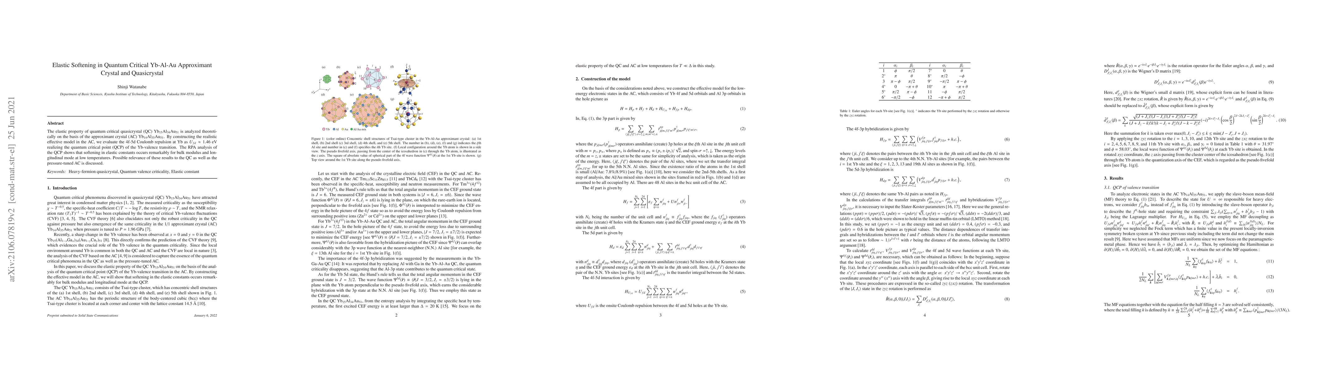 This paper theoretically analyzes the elastic properties of a quantum critical quasicrystal Yb$_{15}$Al$_{34}$Au$_{51}$ using its approximant crystal Yb$_{14}$Al$_{35}$Au$_{51}$. The study finds significant elastic softening in bulk modulus and longitudinal mode at low temperatures, revealing the 4f-5d Coulomb repulsion at Yb as $U_{fd}\approx 1.46$ eV, which marks the quantum critical point.