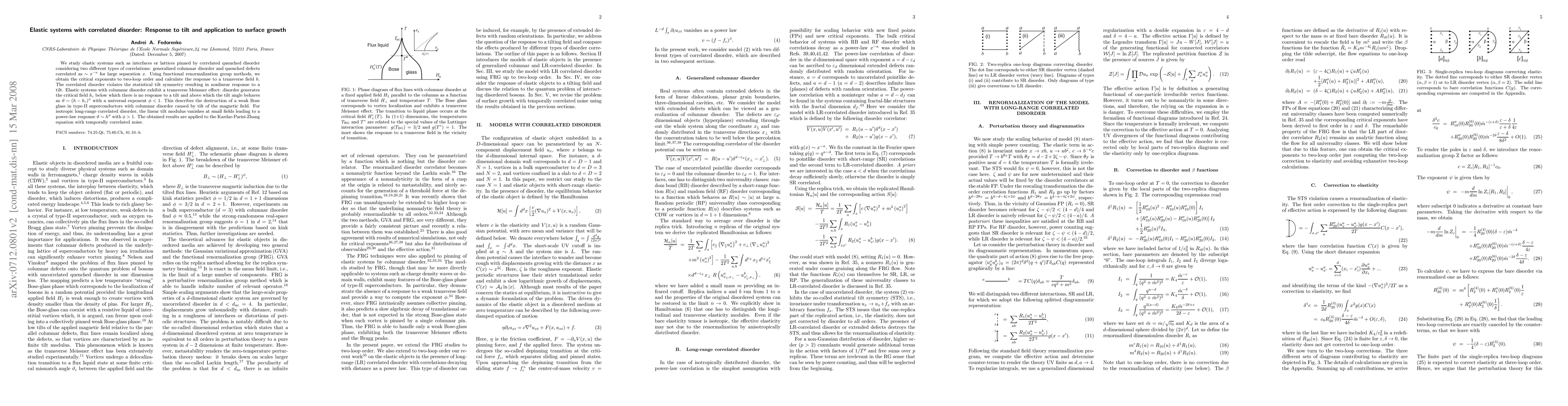 This paper investigates elastic systems with correlated disorder, deriving critical exponents and responses to tilt using functional renormalization group methods. It finds that correlated disorder disrupts tilt symmetry, leading to a nonlinear response characterized by a critical field and a universal exponent, with applications to surface growth models.
