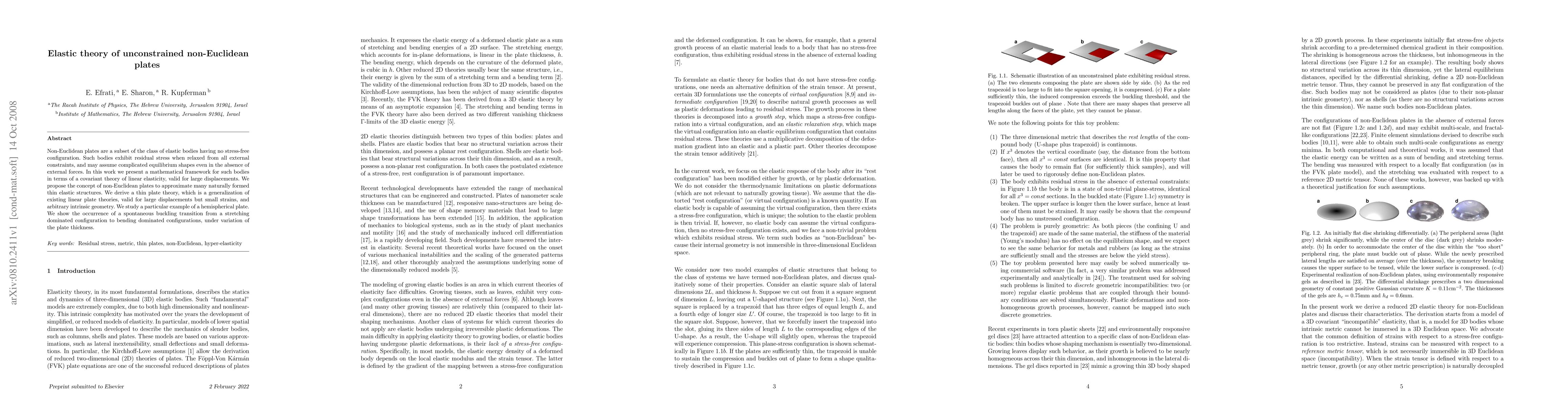 This paper develops a mathematical framework for the elastic theory of unconstrained non-Euclidean plates, which inherently possess residual stress. It proposes a covariant theory of linear elasticity for large displacements and derives a generalized thin plate theory applicable to naturally formed thin elastic structures, demonstrating a spontaneous buckling transition in a hemispherical plate example.