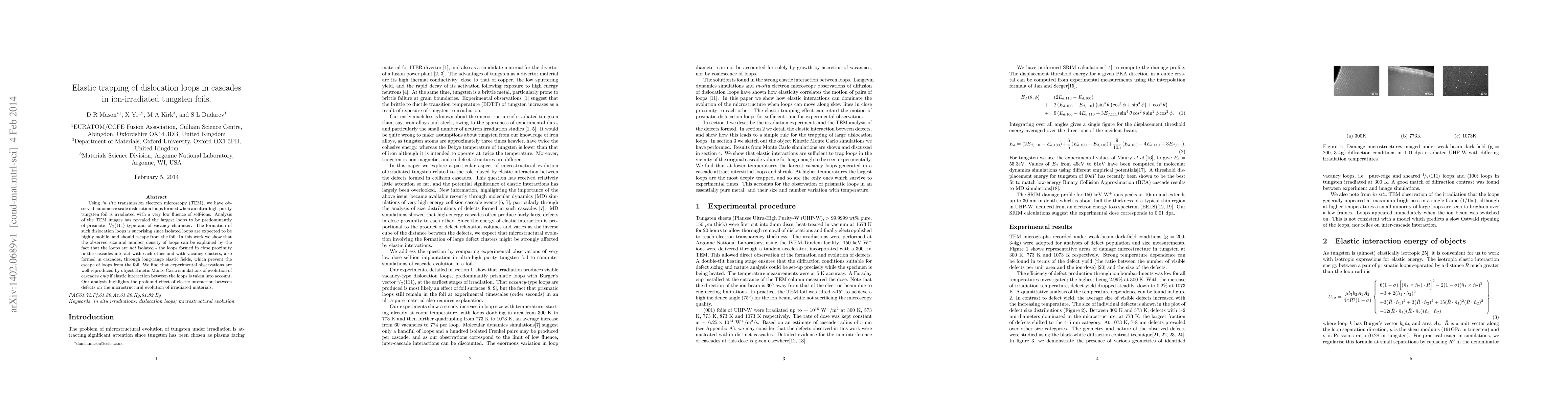 This study reveals that dislocation loops in ion-irradiated tungsten foils are trapped by elastic interactions within cascades, preventing their escape, as shown by _in situ_ TEM and Kinetic Monte Carlo simulations. The findings underscore the significant role of elastic interactions among defects in shaping the microstructure of irradiated materials.