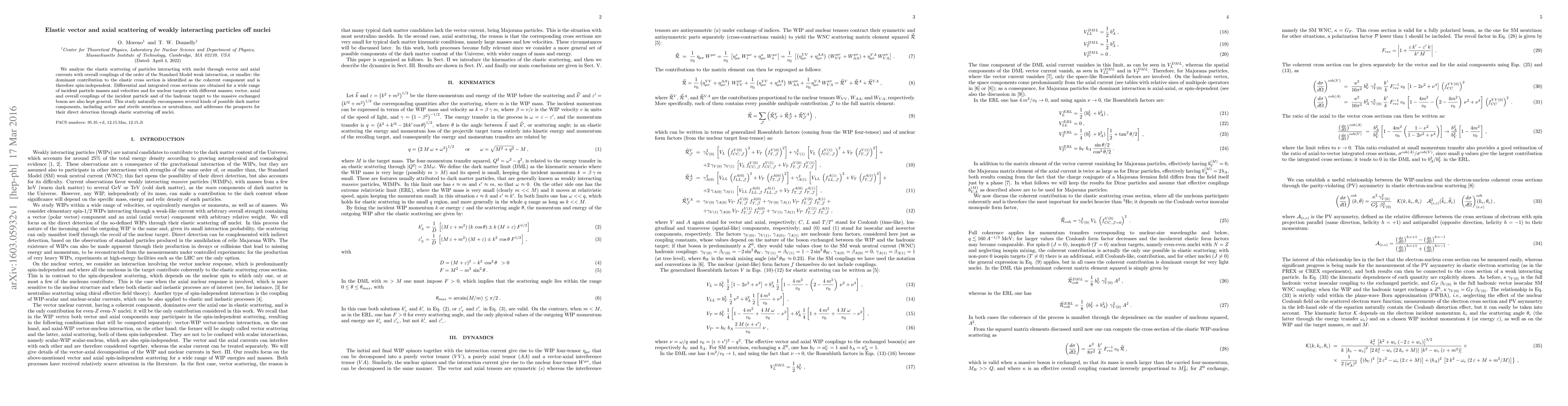 We analyze the elastic scattering of particles interacting with nuclei through vector and axial currents with overall couplings of the order of the Standard Model weak interaction, or smaller; the dominant contribution to the elastic cross section is identified as the coherent component and is therefore spin-independent. Differential and integrated cross sections are obtained for a wide range of incident particle masses and velocities and for nuclear targets with different masses; vector, axial and overall couplings of the incident particle and of the hadronic target to the massive exchanged boson are also kept general. This study naturally encompasses several kinds of possible dark matter components, including active and sterile neutrinos or neutralinos, and addresses the prospects for their direct detection through elastic scattering off nuclei.