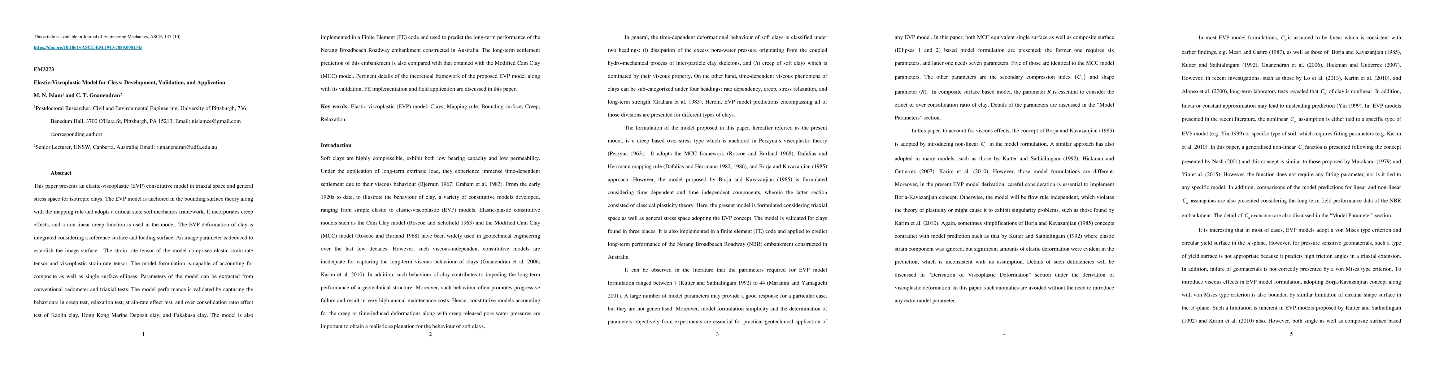 This paper presents an elastic-viscoplastic (EVP) constitutive model in triaxial space and general stress space for isotropic clays. The EVP model is anchored in the bounding surface theory along with the mapping rule and adopts a critical state soil mechanics framework. It incorporates creep effects, and a non-linear creep function is used in the model. The EVP deformation of clay is integrated considering a reference surface and loading surface. An image parameter is deduced to establish the image surface. The strain rate tensor of the model comprises elastic-strain-rate tensor and viscoplastic-strain-rate tensor. The model formulation is capable of accounting for composite as well as single surface ellipses. Parameters of the model can be extracted from conventional oedometer and triaxial tests. The model performance is validated by capturing the behaviours in creep test, relaxation test, strain-rate effect test, and over consolidation ratio effect test of Kaolin clay, Hong Kong Marine Deposit clay, and Fukakusa clay. The model is also implemented in a Finite Element (FE) code and used to predict the long-term performance of the Nerang Broadbeach Roadway embankment constructed in Australia. The long-term settlement prediction of this embankment is also compared with that obtained with the Modified Cam Clay (MCC) model. Pertinent details of the theoretical framework of the proposed EVP model along with its validation, FE implementation and field application are discussed in this paper.