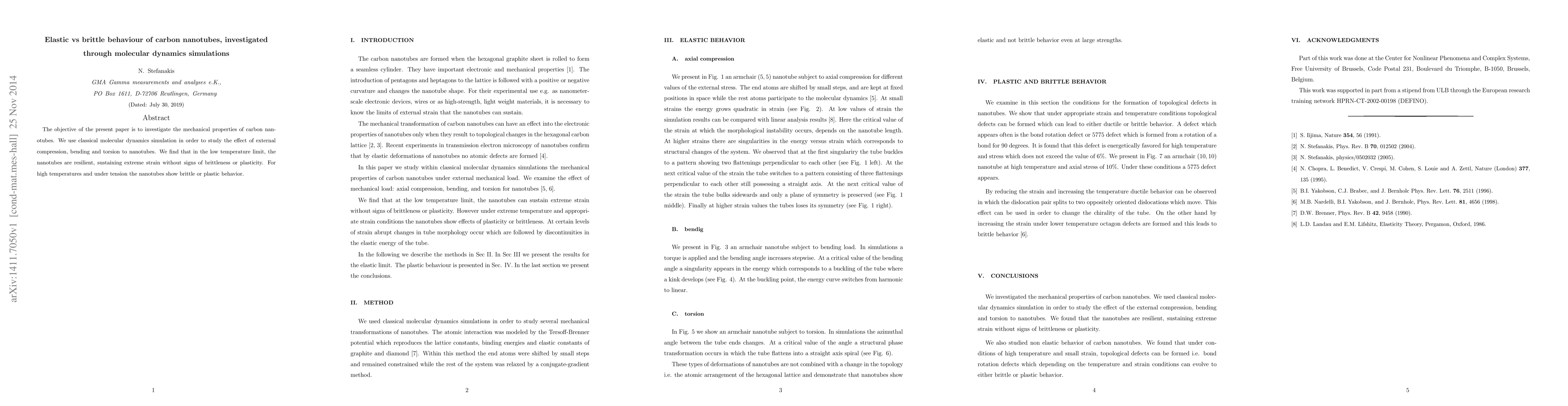 Carbon nanotubes exhibit resilient behavior at low temperatures, but become brittle or plastic under high temperatures and tension. This study uses molecular dynamics simulations to investigate their mechanical properties.