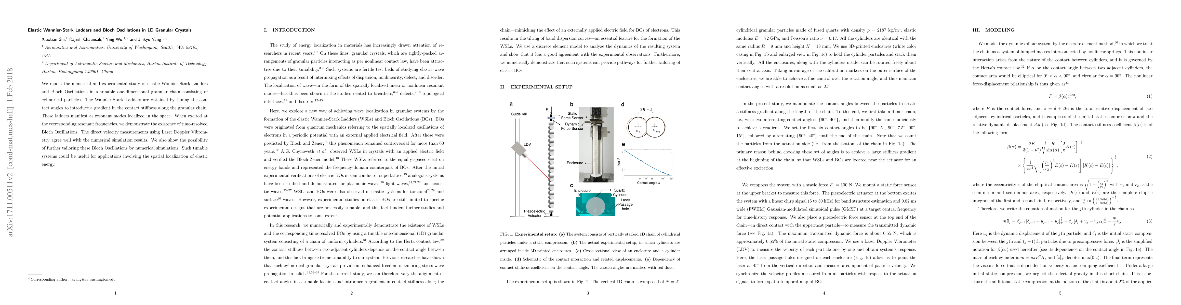 This paper investigates elastic Wannier-Stark Ladders and Bloch Oscillations in a tunable 1D granular crystal, demonstrating resonant modes and time-resolved Bloch Oscillations through numerical and experimental study. Direct velocity measurements align with simulations, highlighting potential applications for spatial localization of elastic energy.