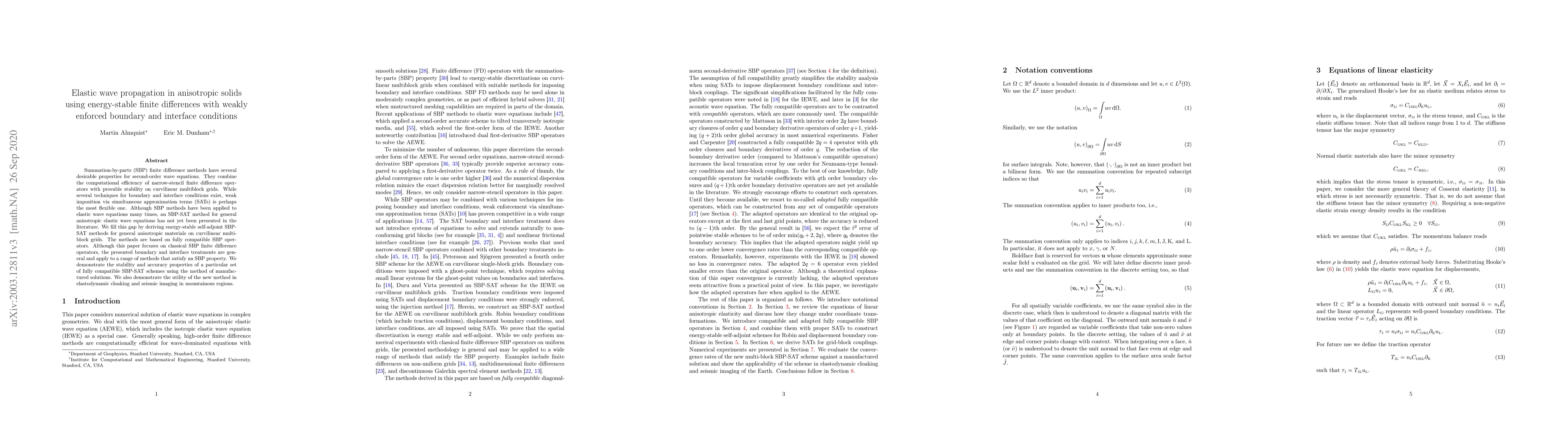 This paper develops an energy-stable finite difference method for elastic wave propagation in anisotropic solids using summation-by-parts (SBP) operators and weak imposition via simultaneous approximation terms (SATs). The proposed SBP-SAT method is shown to be stable and accurate, demonstrated through elastodynamic cloaking and seismic imaging applications.