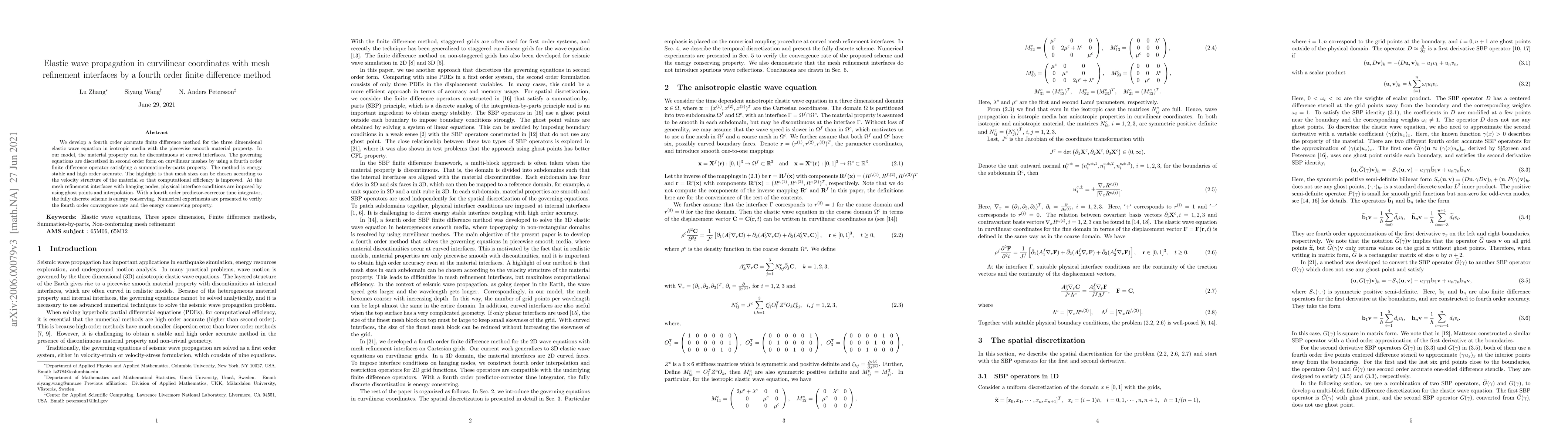 This paper develops a fourth order finite difference method for elastic wave propagation in curvilinear coordinates, allowing for mesh refinement and handling discontinuities at curved interfaces. The method is energy stable, high-order accurate, and employs ghost points and interpolation to enforce physical conditions at refinement interfaces.