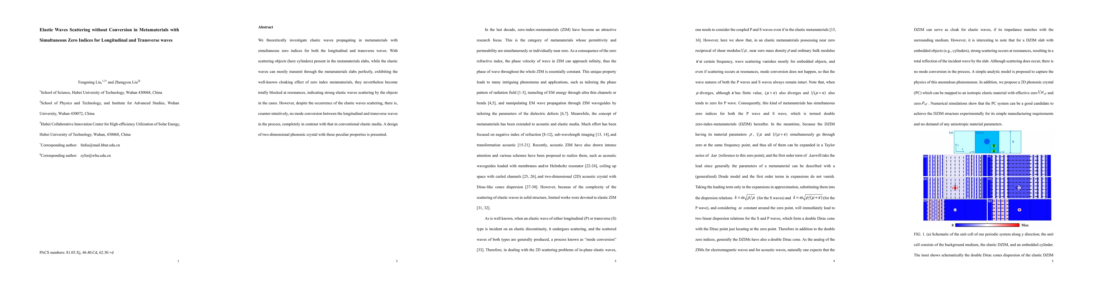 This paper explores elastic waves in metamaterials with zero indices for both longitudinal and transverse waves, demonstrating near-perfect transmission through metamaterial slabs with scattering objects, akin to cloaking. Despite scattering, there is no mode conversion between wave types, a counter-intuitive finding compared to conventional elastic media, and a two-dimensional phononic crystal design is proposed.
