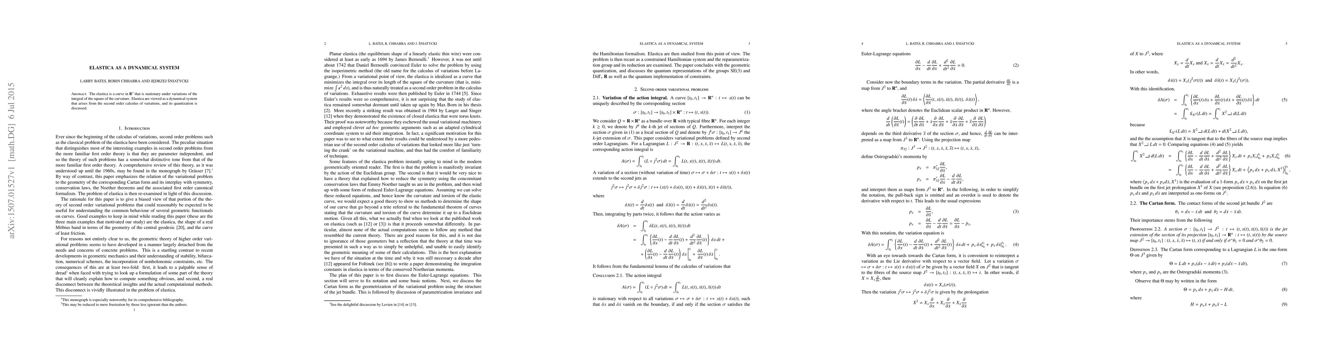 The elastica is a curve in $\R^3$ that is stationary under variations of the integral of the square of the curvature. Elastica is viewed as a dynamical system that arises from the second order calculus of variations, and its quantization is discussed.