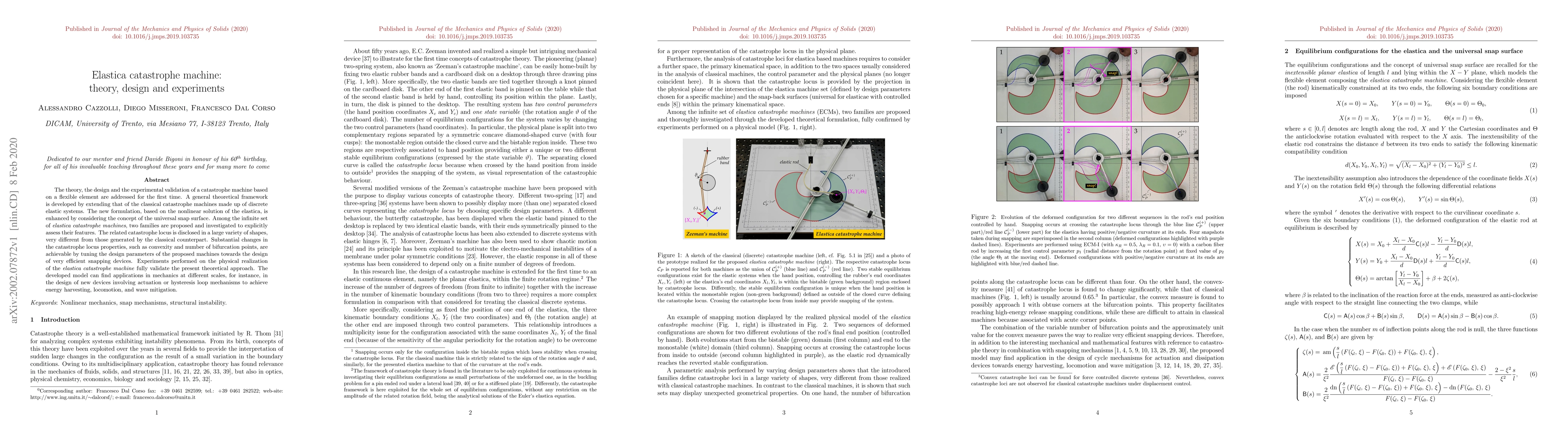 Researchers develop a new design for catastrophe machines based on flexible elements, which can achieve substantial changes in properties like convexity and bifurcation points through tuning of design parameters. The model has applications in various fields including mechanics, energy harvesting, locomotion, and wave mitigation.