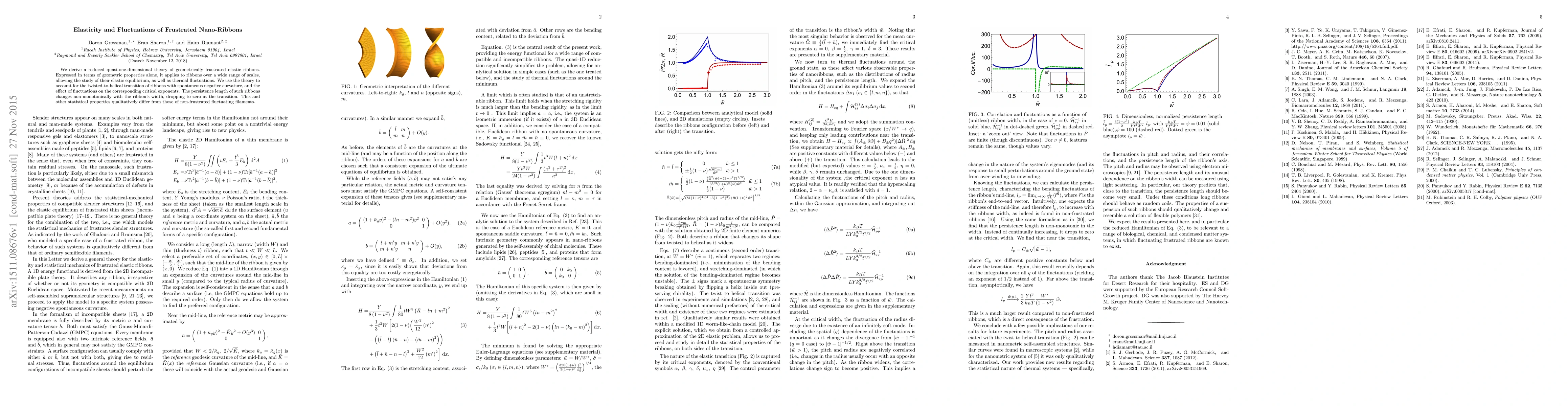 This paper develops a reduced theory for elastic, geometrically frustrated nano-ribbons, revealing their twisted-to-helical transition and the impact of thermal fluctuations on critical exponents. The persistence length of these ribbons decreases non-monotonically with width, contrasting with non-frustrated filaments.