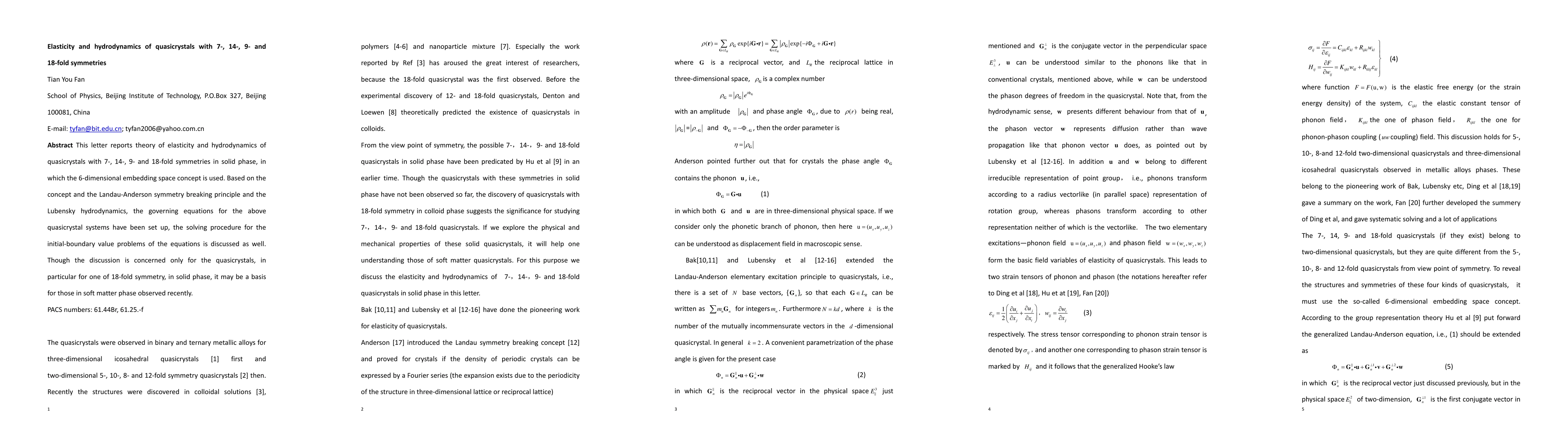 This letter reports theory of elasticity and hydrodynamics of quasicrystals with 7-, 14-, 9- and 18-fold symmetries in solid phase, in which the 6-dimensional embedding space concept is used. Based on the concept and the Landau-Anderson symmetry breaking principle and the Lubensky hydrodynamics, the governing equations for the above quasicrystal systems have been set up, the solving procedure for the initial-boundary value problems of the equations is discussed as well. Though the discussion is concerned only for the quasicrystals, in particular for one of 18-fold symmetry, in solid phase, it may be a basis for those in soft matter phase observed recently.