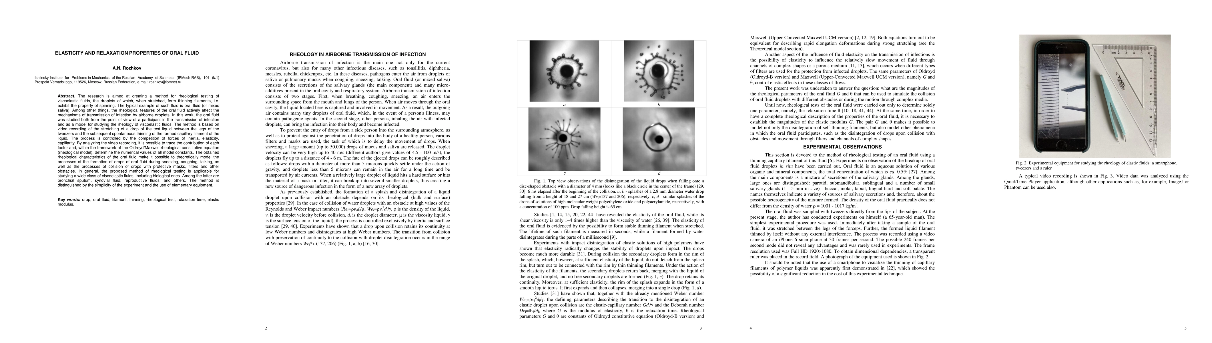 This paper develops a method for rheological testing of viscoelastic fluids like oral fluid, analyzing their elasticity and relaxation properties through video recording of droplet stretching. The method can model infection transmission mechanisms and is applicable to various biological fluids.