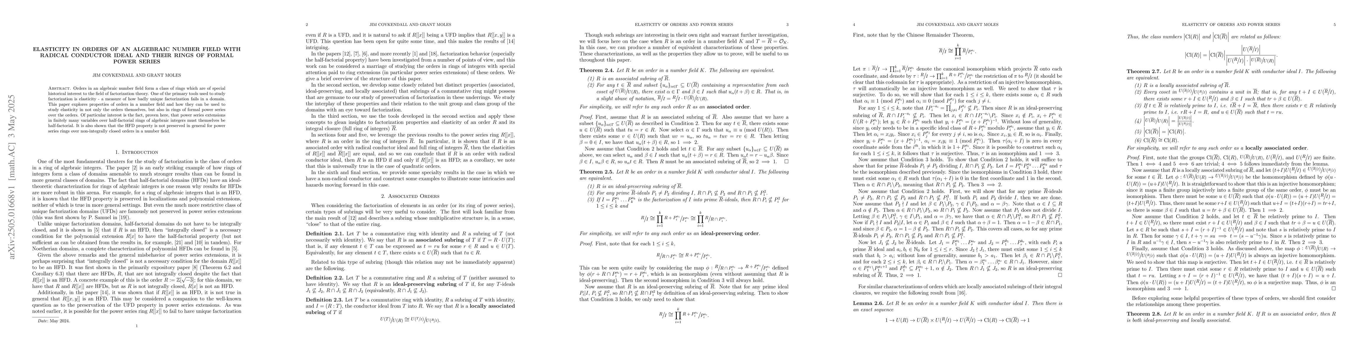 The paper explores properties of orders in a number field, focusing on elasticity in these orders and rings of formal power series over them, specifically proving that power series extensions in finitely many variables over half-factorial rings of algebraic integers are half-factorial.