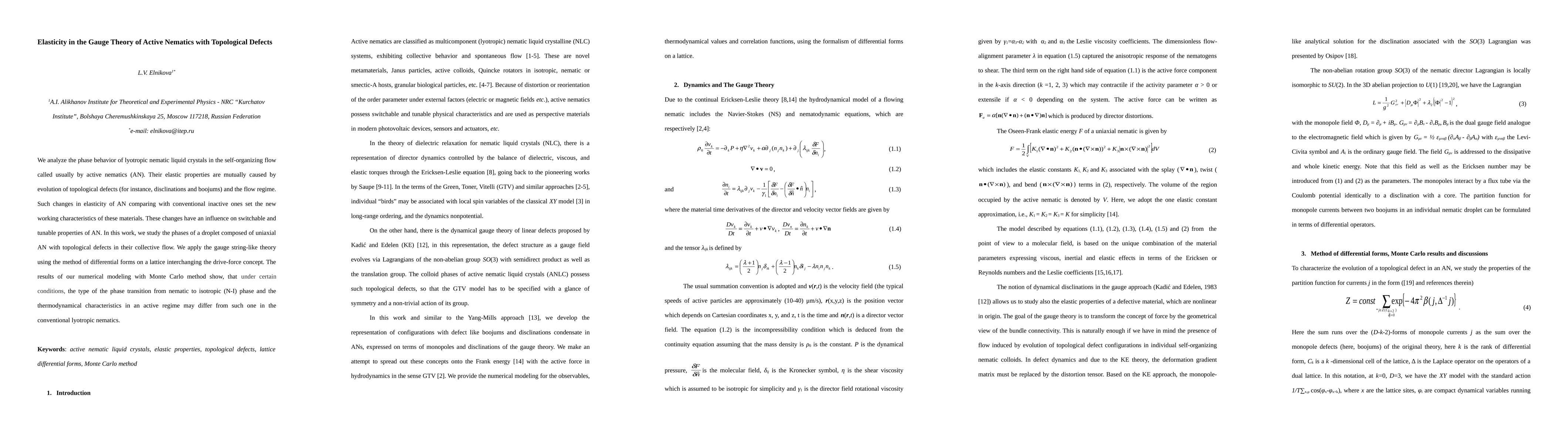 This paper investigates the phase behavior and elasticity of active nematic liquid crystals, focusing on the influence of topological defects and flow regimes. The study employs a gauge theory approach and numerical modeling to reveal distinct phase transitions and thermodynamical characteristics in active nematics compared to conventional inactive ones.