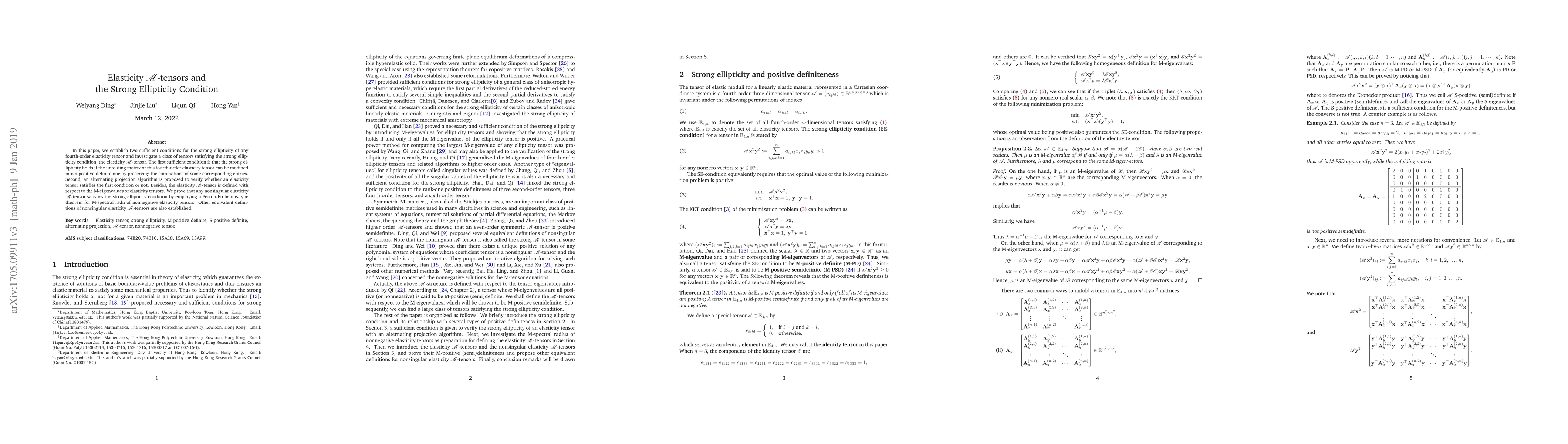 In this paper, we establish two sufficient conditions for the strong ellipticity of any fourth-order elasticity tensor and investigate a class of tensors satisfying the strong ellipticity condition, the elasticity $\mathscr{M}$-tensor. The first sufficient condition is that the strong ellipticity holds if the unfolding matrix of this fourth-order elasticity tensor can be modified into a positive definite one by preserving the summations of some corresponding entries. Second, an alternating projection algorithm is proposed to verify whether an elasticity tensor satisfies the first condition or not. Besides, the elasticity $\mathscr{M}$-tensor is defined with respect to the M-eigenvalues of elasticity tensors. We prove that any nonsingular elasticity $\mathscr{M}$-tensor satisfies the strong ellipticity condition by employing a Perron-Frobenius-type theorem for M-spectral radii of nonnegative elasticity tensors. Other equivalent definitions of nonsingular elasticity $\mathscr{M}$-tensors are also established.
