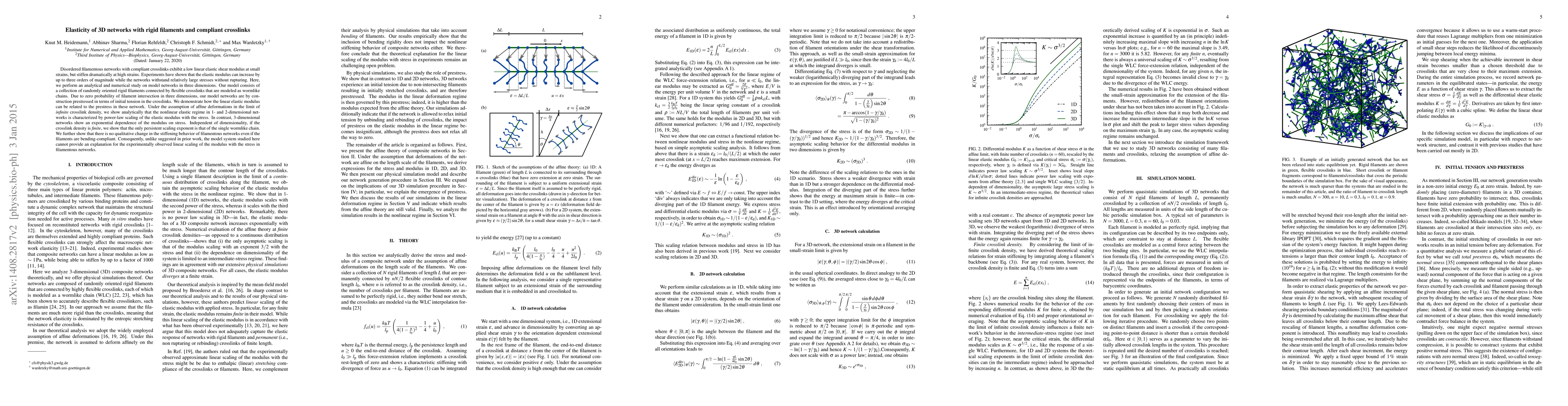 This paper investigates the elasticity of 3D disordered filamentous networks with compliant crosslinks, showing that while the elastic modulus increases dramatically with stress, the relationship is exponential in three dimensions rather than linear. The study concludes that the model cannot explain the linear scaling observed in experiments.