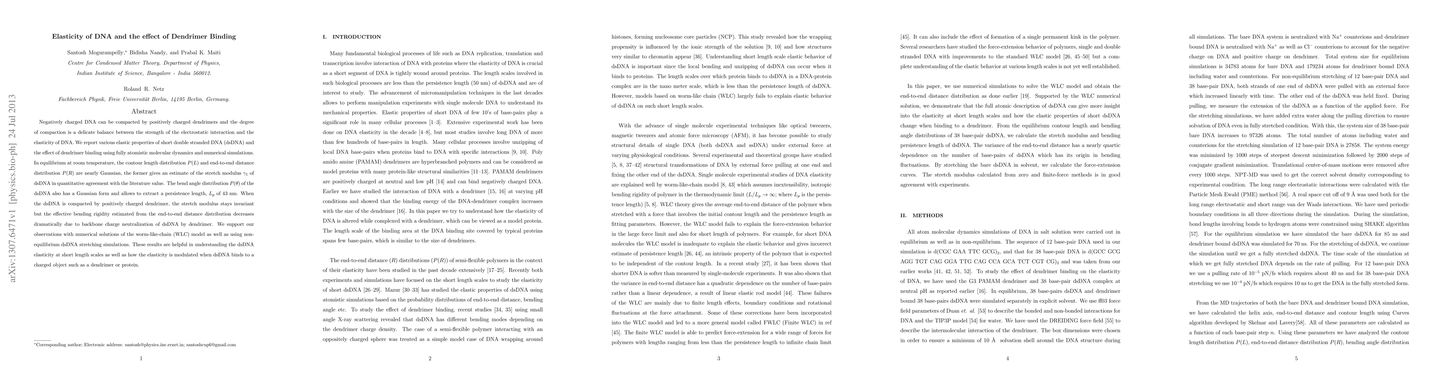 Negatively charged DNA can be compacted by positively charged dendrimers and the degree of compaction is a delicate balance between the strength of the electrostatic interaction and the elasticity of DNA. We report various elastic properties of short double stranded DNA (dsDNA) and the effect of dendrimer binding using fully atomistic molecular dynamics and numerical simulations. In equilibrium at room temperature, the contour length distribution P(L) and end-to-end distance distribution P(R) are nearly Gaussian, the former gives an estimate of the stretch modulus {\gamma}_1 of dsDNA in quantitative agreement with the literature value. The bend angle distribution P({\theta}) of the dsDNA also has a Gaussian form and allows to extract a persistence length, L_p of 43 nm. When the dsDNA is compacted by positively charged dendrimer, the stretch modulus stays invariant but the effective bending rigidity estimated from the end-to-end distance distribution decreases dramatically due to backbone charge neutralization of dsDNA by dendrimer. We support our observations with numerical solutions of the worm-like-chain (WLC) model as well as using non-equilibrium dsDNA stretching simulations. These results are helpful in understanding the dsDNA elasticity at short length scales as well as how the elasticity is modulated when dsDNA binds to a charged object such as a dendrimer or protein.