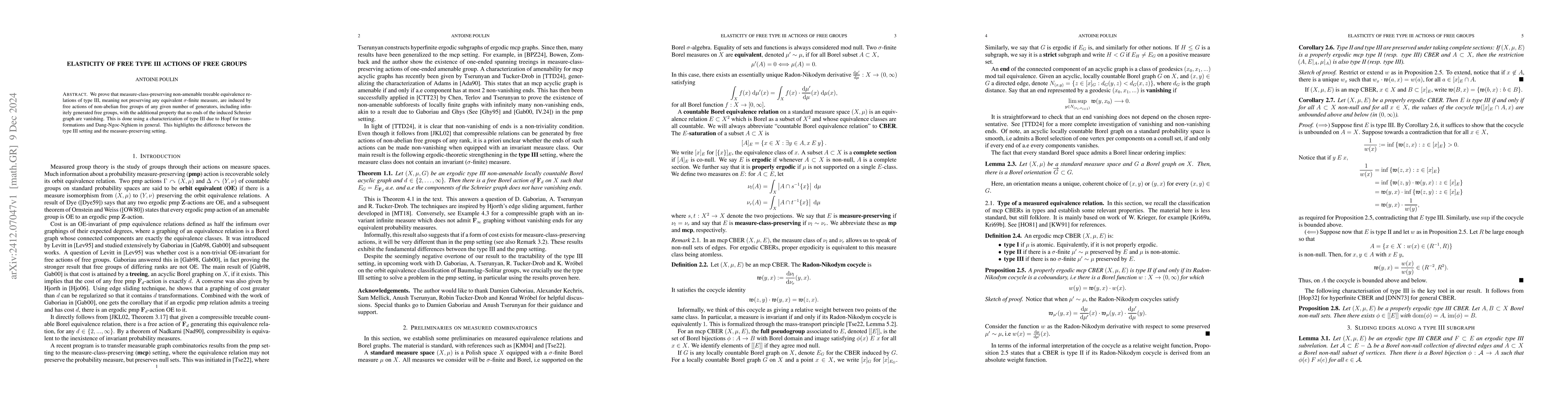 This paper establishes that measure-class-preserving, non-amenable treeable equivalence relations of type III are generated by free actions of non-abelian free groups, emphasizing their unique properties compared to measure-preserving settings. It leverages Hopf's and Dang-Ngoc-Nghiem's characterization of type III relations, extending the findings to include infinitely generated free groups.