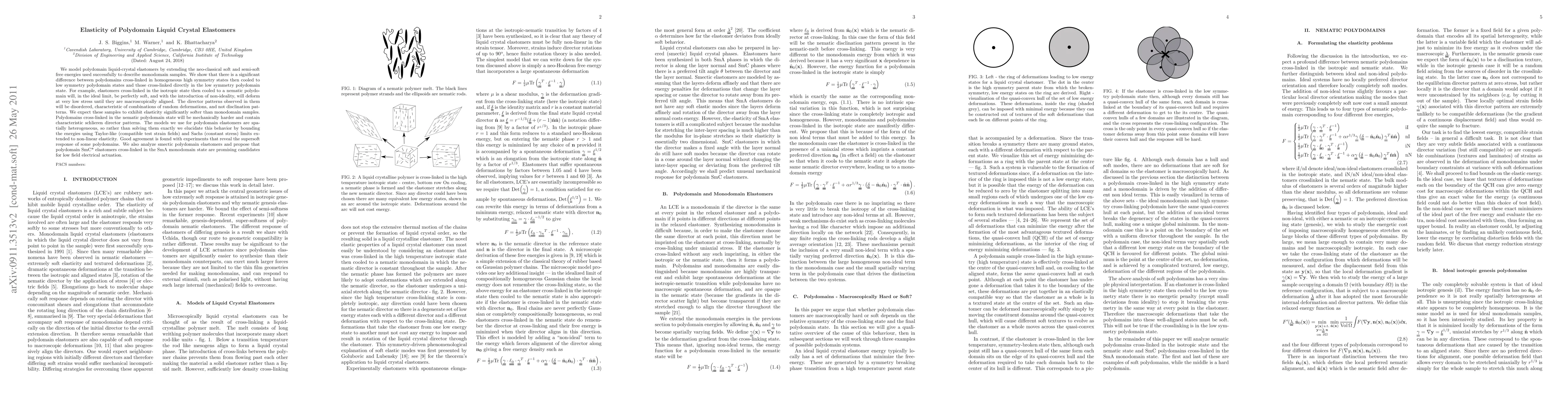 This paper models polydomain liquid-crystal elastomers using extended neo-classical soft and semi-soft free energies, finding significant differences in elasticity based on cooling and initial cross-linking states. Elastomers cross-linked in high symmetry states then cooled exhibit softer elasticity and disordered director patterns, while those directly cross-linked in low symmetry states show mechanical hardness and schlieren patterns.