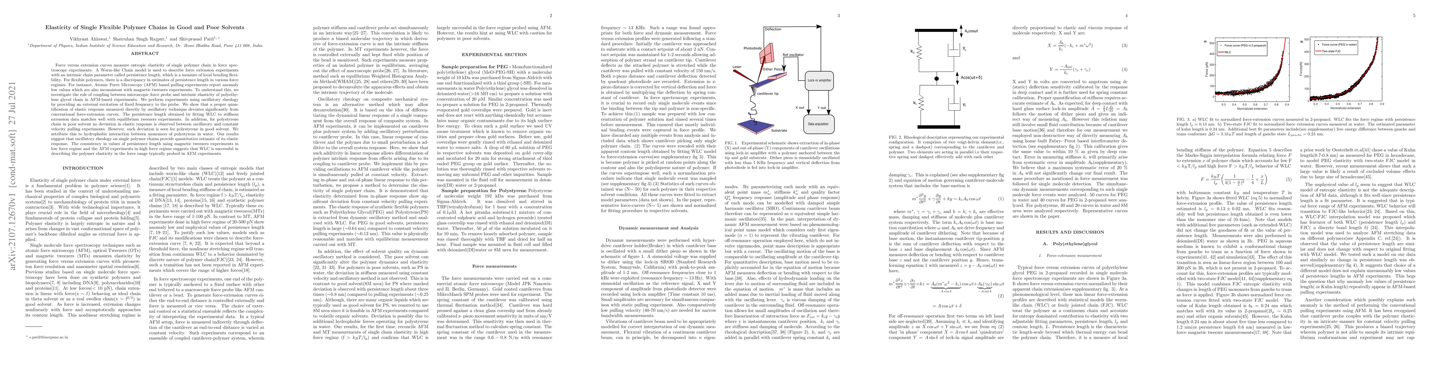 This study investigates the discrepancy in persistence length estimates of flexible polymer chains using different force spectroscopy techniques. It finds that oscillatory rheology provides a more accurate measure of elasticity compared to conventional force-extension curves, especially in good solvents where hydrophobic interactions affect polymer behavior.