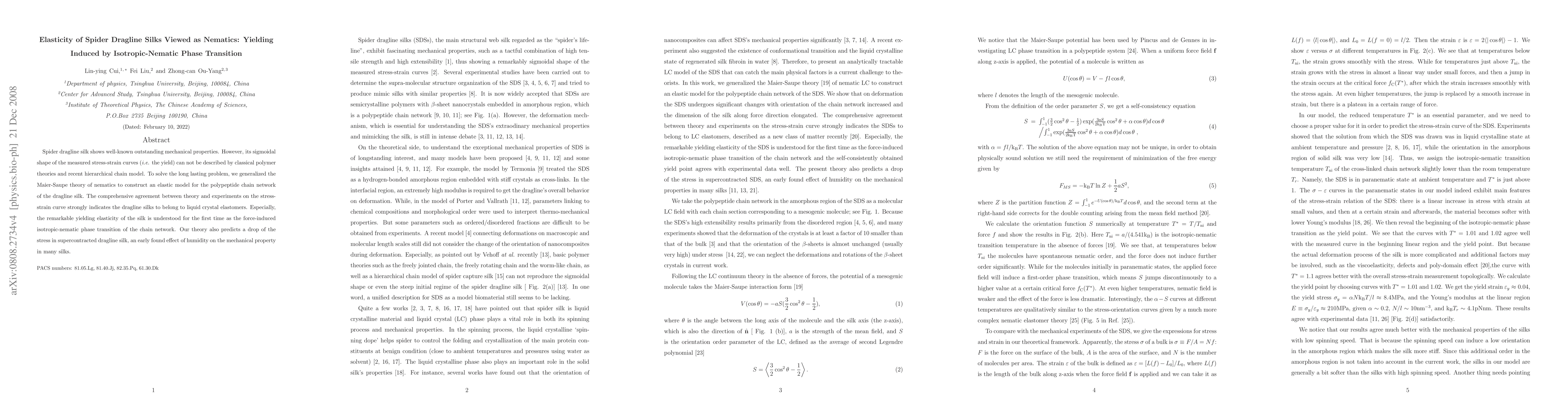 Spider dragline silk shows well-known outstanding mechanical properties. However, its sigmoidal shape of the measured stress-strain curves (i.e. the yield) can not be described by classical polymer theories and recent hierarchical chain model. To solve the long lasting problem, we generalized the Maier-Saupe theory of nematics to construct an elastic model for the polypeptide chain network of the dragline silk. The comprehensive agreement between theory and experiments on the stress-strain curve strongly indicates the dragline silks to belong to liquid crystal elastomers. Especially, the remarkable yielding elasticity of the silk is understood for the first time as the force-induced isotropic-nematic phase transition of the chain network. Our theory also predicts a drop of the stress in supercontracted dragline silk, an early found effect of humidity on the mechanical property in many silks.