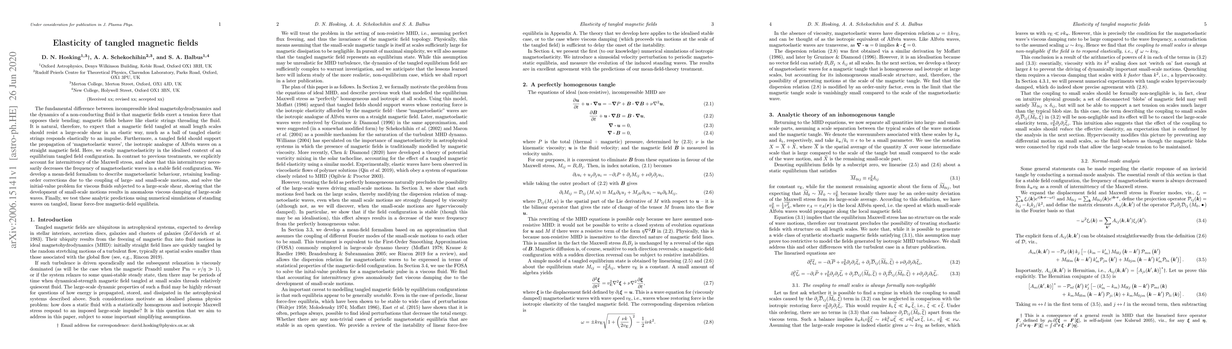 This paper investigates the elastic properties of tangled magnetic fields in magnetohydrodynamics, demonstrating that such fields resist large-scale shears and support magnetoelastic waves. It develops a mean-field formalism to describe these behaviors, showing that intermittency in the Maxwell stress lowers the frequency of magnetoelastic waves and leads to anomalous viscous damping under large-scale shears, validated through numerical simulations.