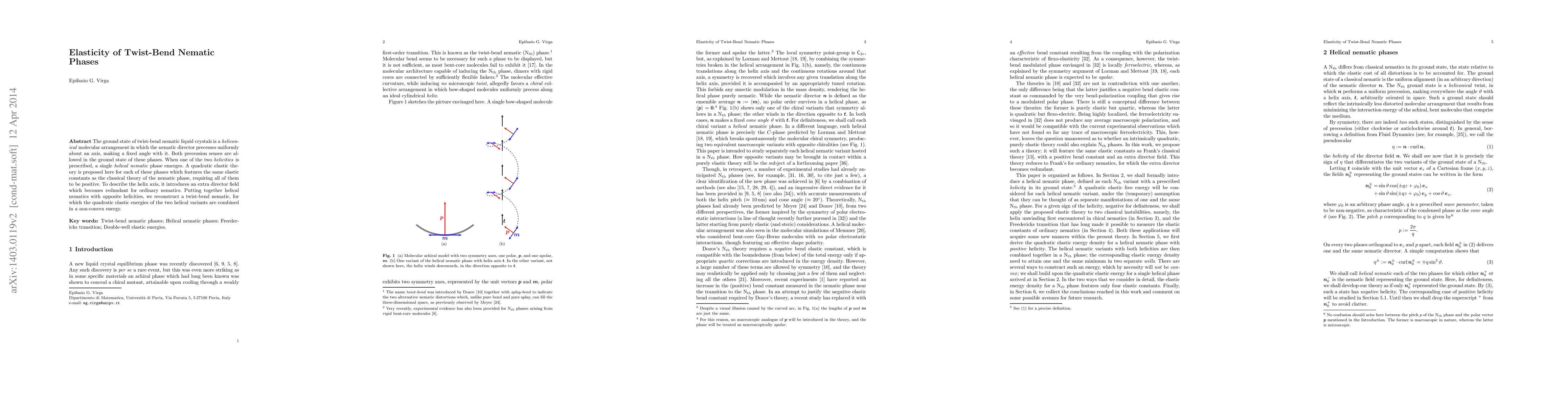 The ground state of twist-bend nematic liquid crystals is a heliconical molecular arrangement in which the nematic director precesses uniformly about an axis, making a fixed angle with it. Both precession senses are allowed in the ground state of these phases. When one of the two \emph{helicities} is prescribed, a single helical nematic phase emerges. A quadratic elastic theory is proposed here for each of these phases which features the same elastic constants as the classical theory of the nematic phase, requiring all of them to be positive. To describe the helix axis, it introduces an extra director field which becomes redundant for ordinary nematics. Putting together helical nematics with opposite helicities, we reconstruct a twist-bend nematic, for which the quadratic elastic energies of the two helical variants are combined in a non-convex energy.