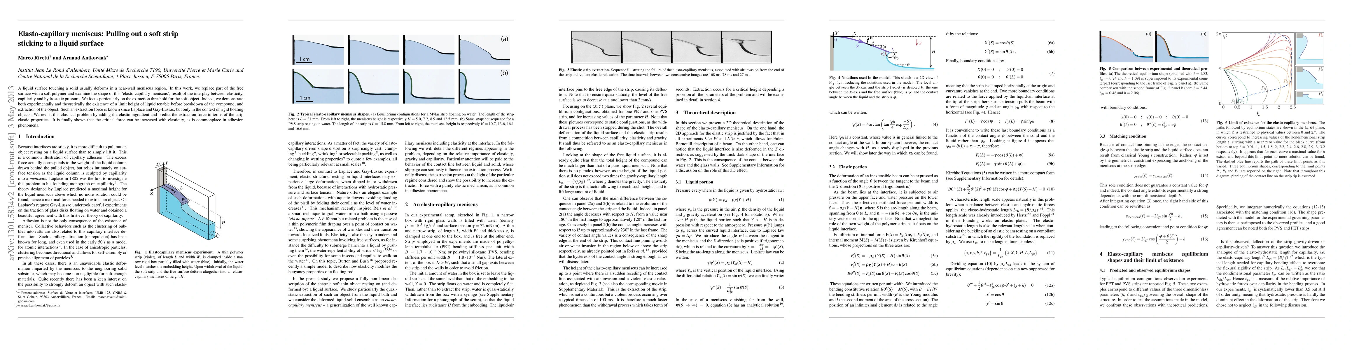 This paper investigates the elasto-capillary meniscus formed when a soft polymer strip adheres to a liquid surface, exploring the interplay between elasticity, capillarity, and hydrostatic pressure. The study reveals a critical extraction threshold that depends on the strip's elastic properties, demonstrating that elasticity can increase the critical force needed to extract the strip.