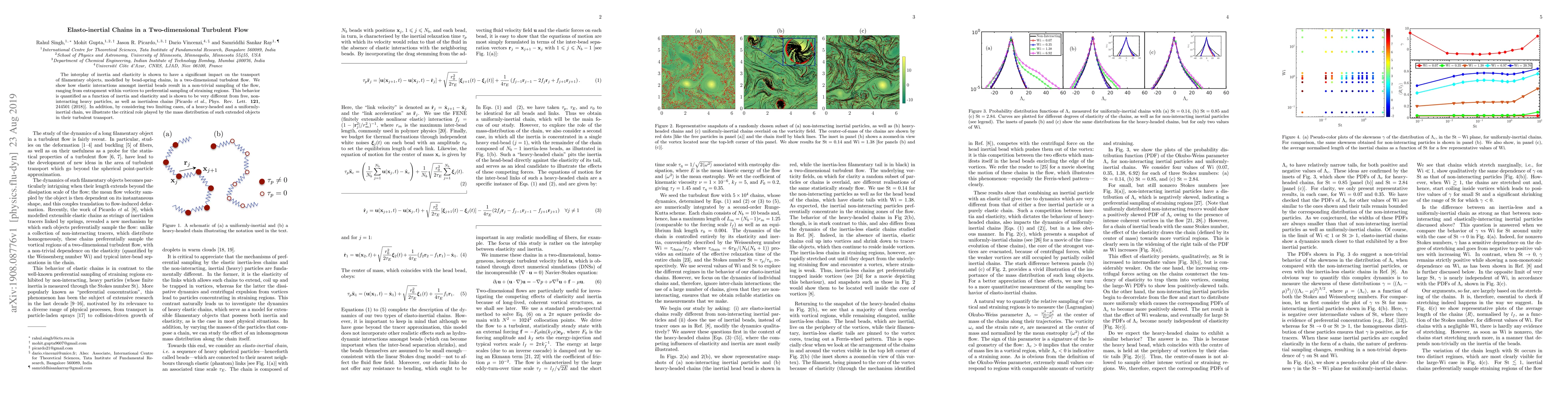 The interplay of inertia and elasticity is shown to have a significant impact on the transport of filamentary objects, modelled by bead-spring chains, in a two-dimensional turbulent flow. We show how elastic interactions amongst inertial beads result in a non-trivial sampling of the flow, ranging from entrapment within vortices to preferential sampling of straining regions. This behavior is quantified as a function of inertia and elasticity and is shown to be very different from free, non-interacting heavy particles, as well as inertialess chains [Picardo et al., Phys. Rev. Lett. 121, 244501 (2018)]. In addition, by considering two limiting cases, of a heavy-headed and a uniformly-inertial chain, we illustrate the critical role played by the mass distribution of such extended objects in their turbulent transport.