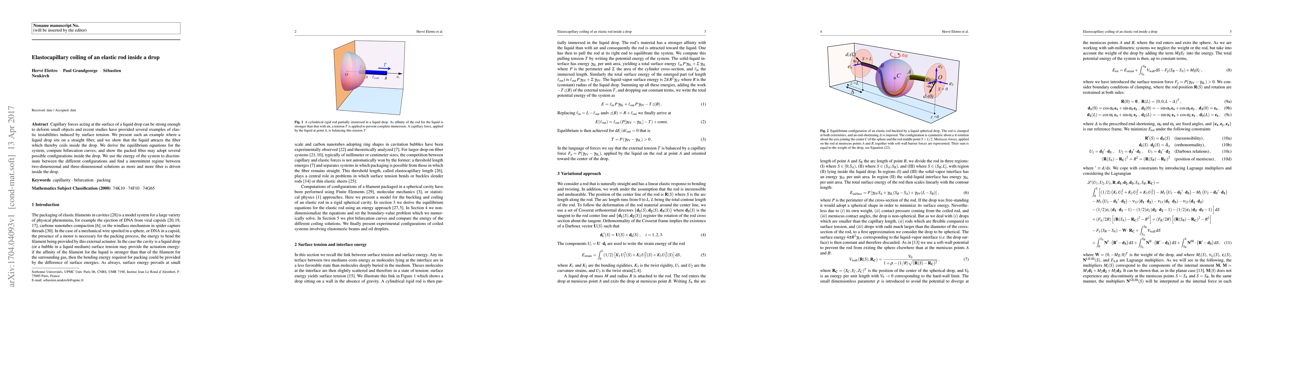 A liquid drop on a straight fiber can cause the fiber to coil inside the drop due to capillary forces, with the system exhibiting multiple possible configurations and an intermittent regime between two-dimensional and three-dimensional solutions.