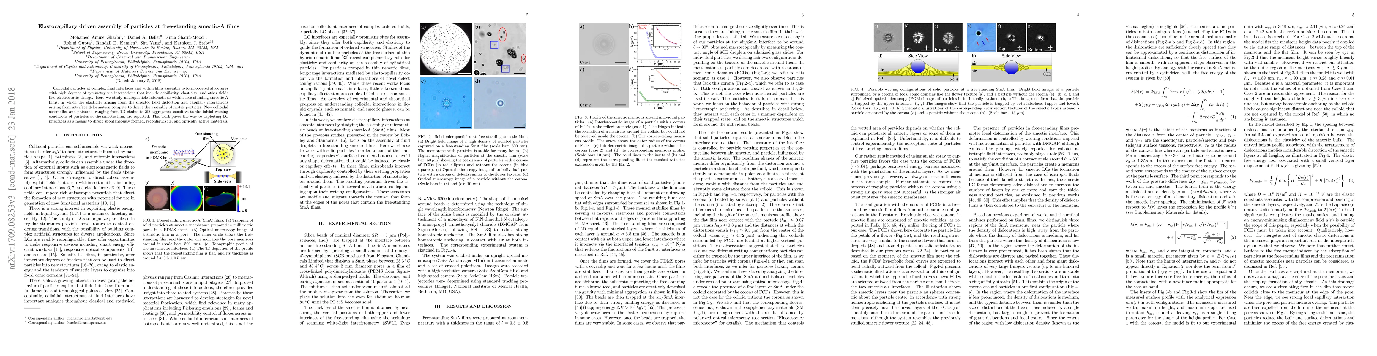 Colloidal particles at complex fluid interfaces and within films assemble to form ordered structures with high degrees of symmetry via interactions that include capillarity, elasticity, and other fields like electrostatic charge. Here we study microparticle interactions within free-standing smectic-A films, in which the elasticity arising from the director field distortion and capillary interactions arising from interface deformation compete to direct the assembly of motile particles. New colloidal assemblies and patterns, ranging from 1D chains to 2D aggregates, sensitive to the initial wetting conditions of particles at the smectic film, are reported. This work paves the way to exploiting LC interfaces as a means to direct spontaneously formed, reconfigurable, and optically active materials.