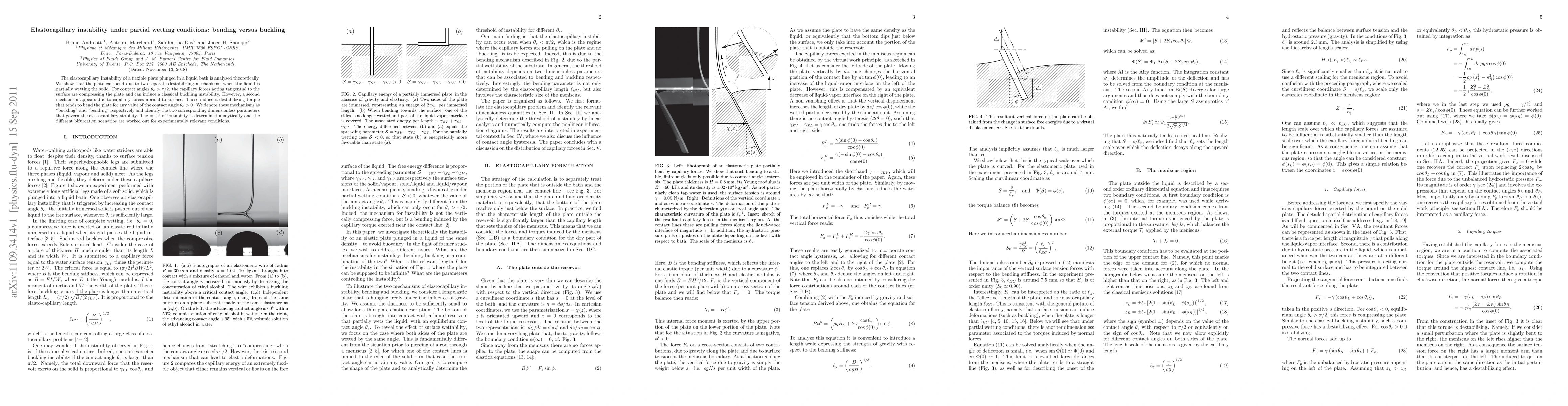 This paper theoretically analyzes elastocapillary instability of a flexible plate in a liquid bath, identifying two destabilizing mechanisms under partial wetting: classical buckling due to tangential capillary forces and bending due to normal capillary forces, each governed by distinct dimensionless parameters.
