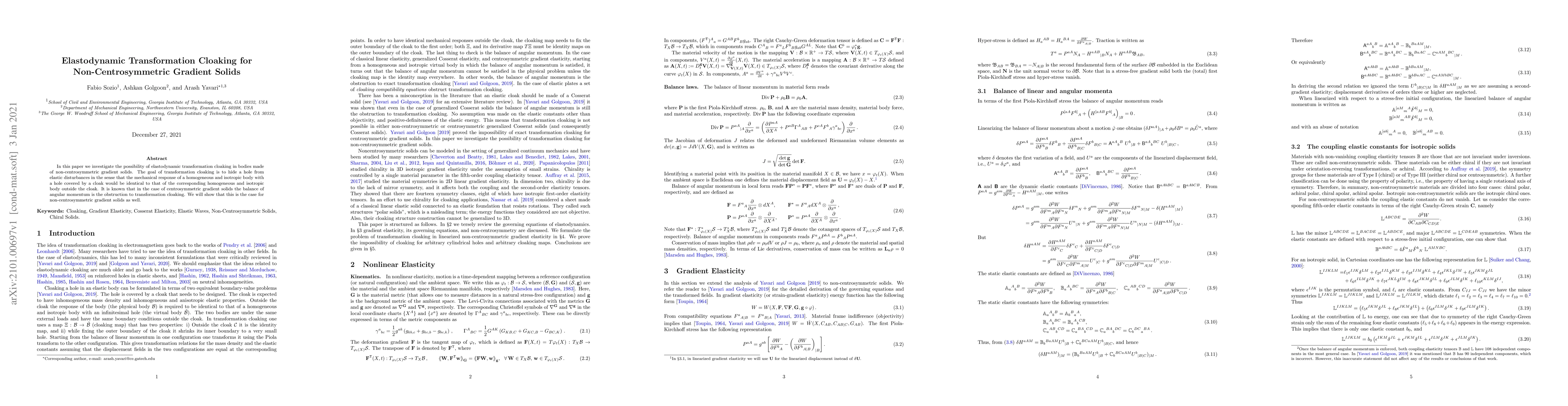 This paper explores elastodynamic transformation cloaking in non-centrosymmetric gradient solids, aiming to hide a hole from elastic disturbances. It finds that, similar to centrosymmetric solids, the balance of angular momentum hinders cloaking in these materials.