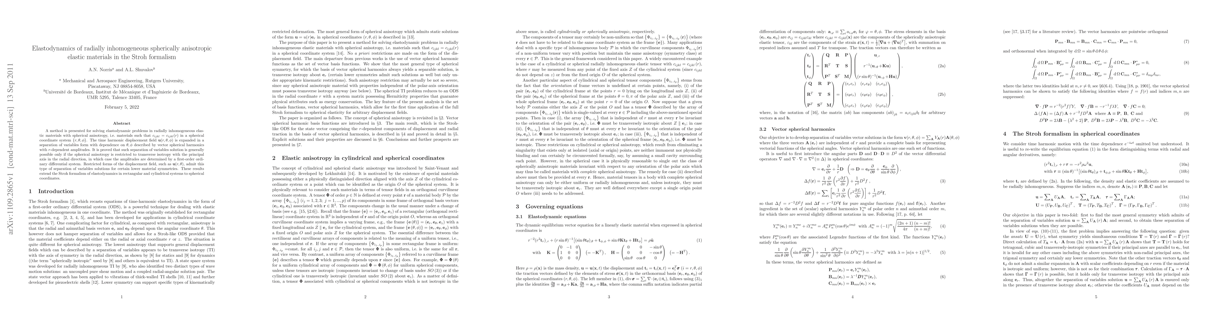 A method is presented for solving elastodynamic problems in radially inhomogeneous elastic materials with spherical anisotropy, i.e.\ materials such that $c_{ijkl}= c_{ijkl}(r)$ in a spherical coordinate system ${r,\theta,\phi}$. The time harmonic displacement field $\mathbf{u}(r,\theta ,\phi)$ is expanded in a separation of variables form with dependence on $\theta,\phi$ described by vector spherical harmonics with $r$-dependent amplitudes. It is proved that such separation of variables solution is generally possible only if the spherical anisotropy is restricted to transverse isotropy with the principal axis in the radial direction, in which case the amplitudes are determined by a first-order ordinary differential system. Restricted forms of the displacement field, such as $\mathbf{u}(r,\theta)$, admit this type of separation of variables solutions for certain lower material symmetries. These results extend the Stroh formalism of elastodynamics in rectangular and cylindrical systems to spherical coordinates.