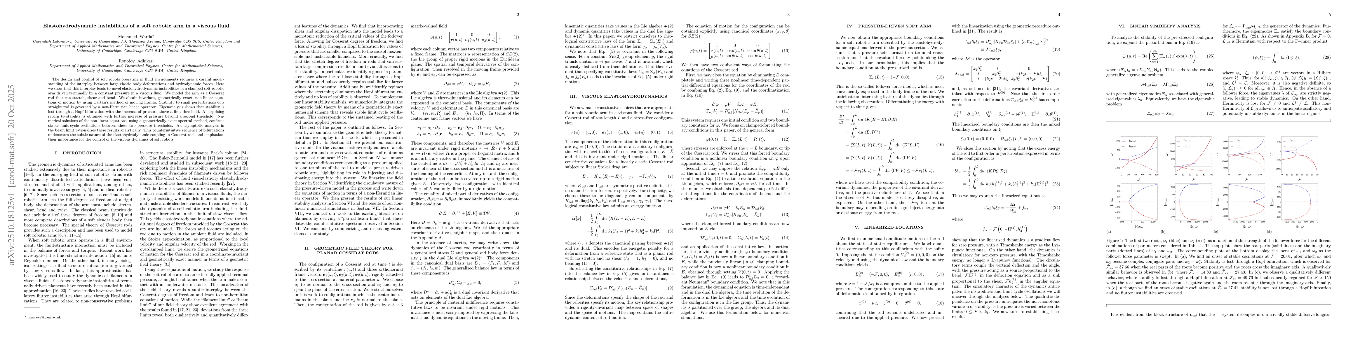 The design and control of soft robots operating in fluid environments requires a careful understanding of the interplay between large elastic body deformations and hydrodynamic forces. Here we show that this interplay leads to novel elastohydrodynamic instabilities in a clamped soft robotic arm driven terminally by a constant pressure in a viscous fluid. We model the arm as a Cosserat rod that can stretch, shear and bend. We obtain invariant, geometrically exact, non-linear equations of motion by using Cartan's method of moving frames. Stability to small perturbations of a straight rod is governed by a non-Hermitian linear operator. Eigenanalysis shows that stability is lost through a Hopf bifurcation with the increase of pressure above a first threshold. A surprising return to stability is obtained with further increase of pressure beyond a second threshold. Numerical solutions of the non-linear equations, using a geometrically exact spectral method, confirms stable limit-cycle oscillations between these two pressure thresholds. An asymptotic analysis in the beam limit rationalizes these results analytically. This counterintuitive sequence of bifurcations underscores the subtle nature of the elastohydrodynamic coupling in Cosserat rods and emphasizes their importance for the control of the viscous dynamics of soft robots.