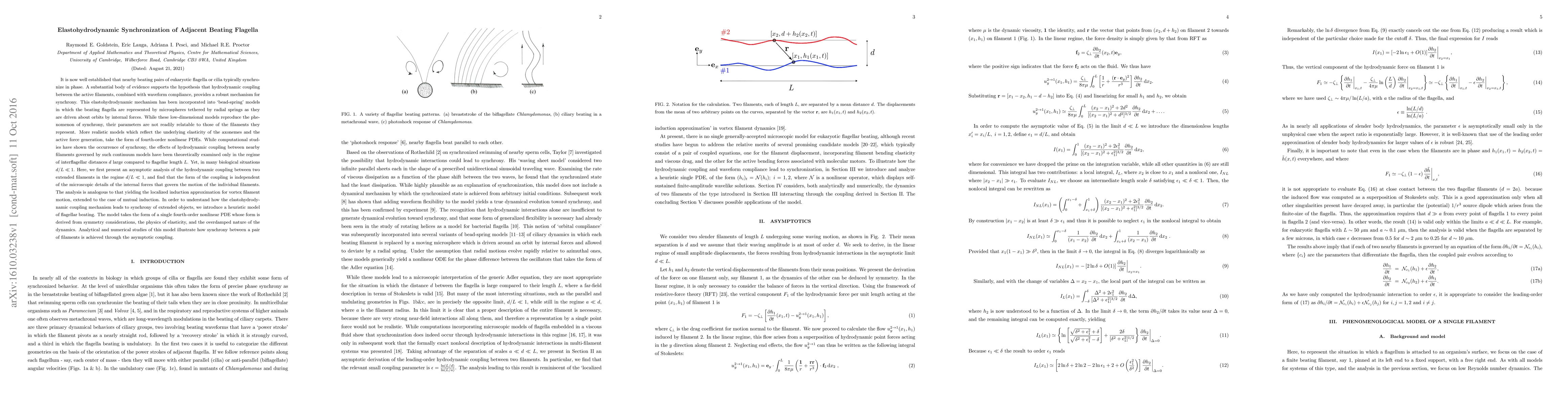 This paper investigates the elastohydrodynamic synchronization of adjacent beating flagella, proposing that hydrodynamic coupling and waveform compliance are key mechanisms for synchrony. It develops an asymptotic analysis for the coupling between filaments when interflagellar distances are much smaller than flagellar length, revealing a coupling form independent of internal forces, and uses a heuristic model to demonstrate how this coupling leads to synchrony.