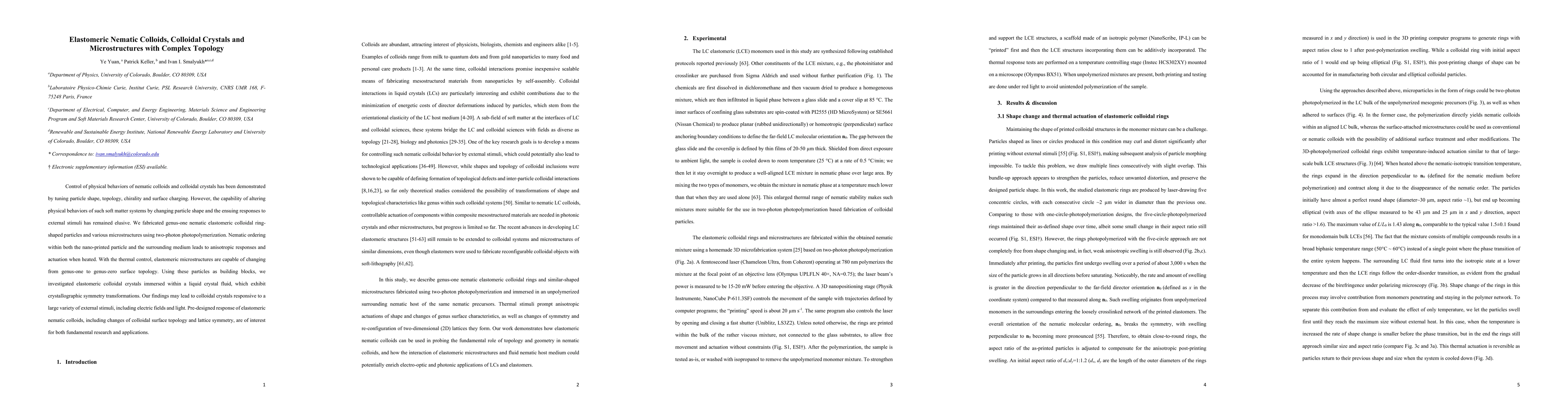 This paper explores the fabrication and control of genus-one elastomeric nematic colloidal ring-shaped particles using two-photon photopolymerization, demonstrating their ability to undergo topological changes and symmetry transformations in response to thermal stimuli. The study highlights potential applications in responsive colloidal crystals and soft matter systems.