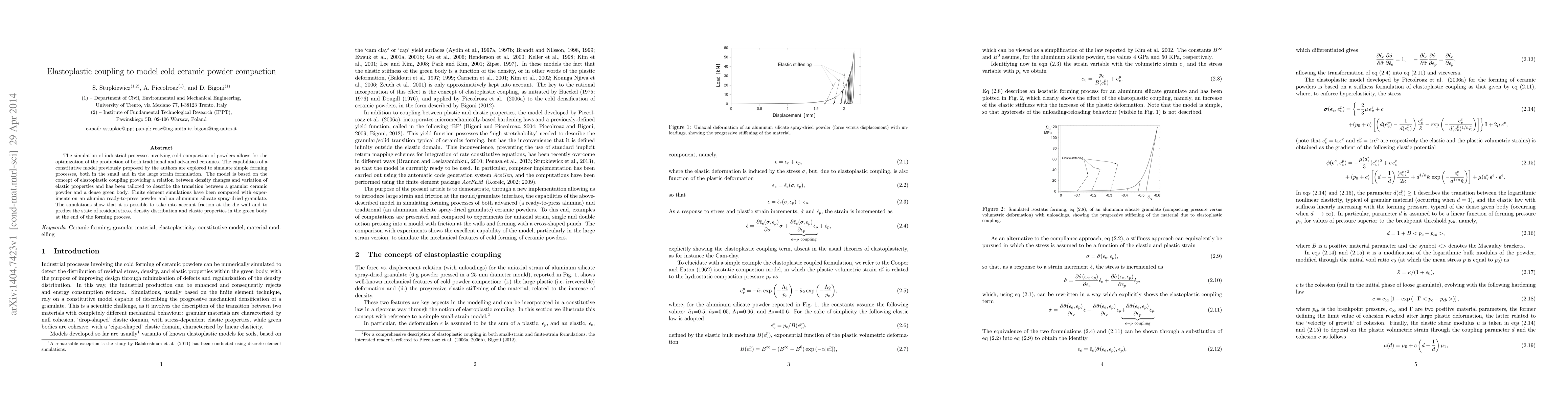 This paper explores the use of an elastoplastic coupling model to simulate the cold compaction of ceramic powders, comparing finite element simulations with experimental results on alumina and aluminum silicate powders. The model successfully predicts residual stress, density distribution, and elastic properties in the compacted green body.