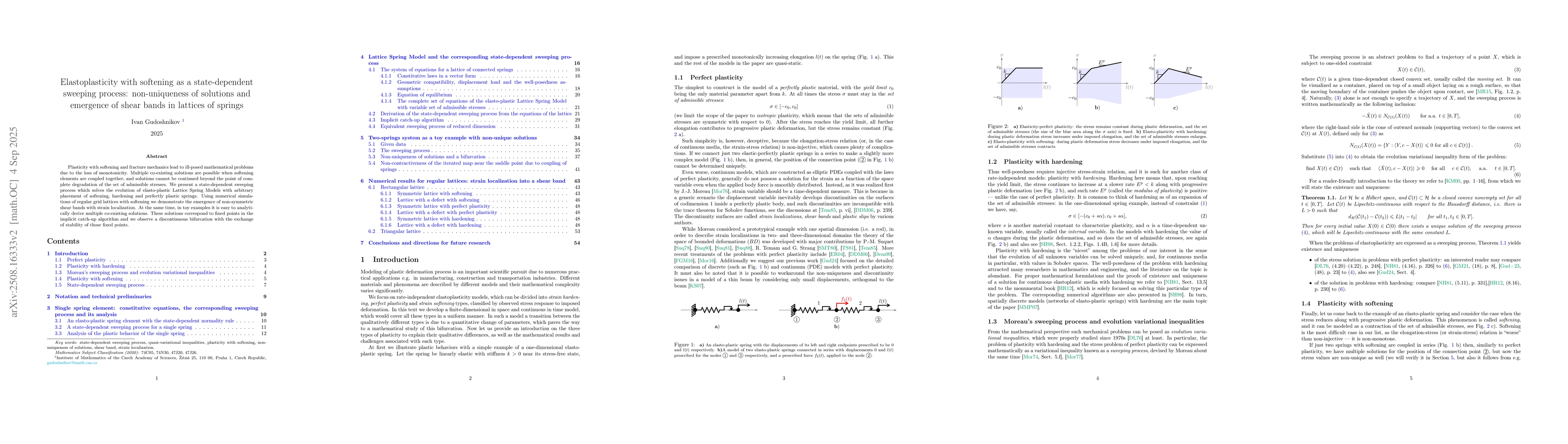 Plasticity with softening and fracture mechanics lead to ill-posed mathematical problems due to the loss of monotonicity. Multiple co-existing solutions are possible when softening elements are coupled together, and solutions cannot be continued beyond the point of complete degradation of the set of admissible stresses. We present a state-dependent sweeping process which solves the evolution of elasto-plastic Lattice Spring Models with arbitrary placement of softening, hardening and perfectly plastic springs. Using numerical simulations of regular grid lattices with softening we demonstrate the emergence of non-symmetric shear bands with strain localization. At the same time, in toy examples it is easy to analytically derive multiple co-existing solutions. These solutions correspond to fixed points in the implicit catch-up algorithm and we observe a discontinuous bifurcation with the exchange of stability of those fixed points.