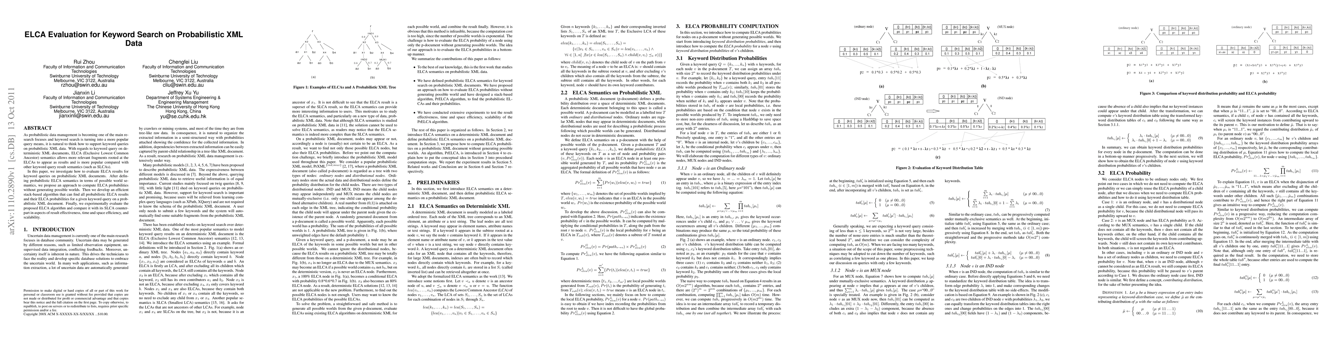 This paper proposes a method to evaluate ELCA (Exclusive Lowest Common Ancestor) semantics for keyword searches on probabilistic XML data, introducing a stack-based algorithm to compute ELCA probabilities efficiently without generating possible worlds, and comparing its effectiveness and efficiency against SLCA (Shared Lowest Common Ancestor) semantics.