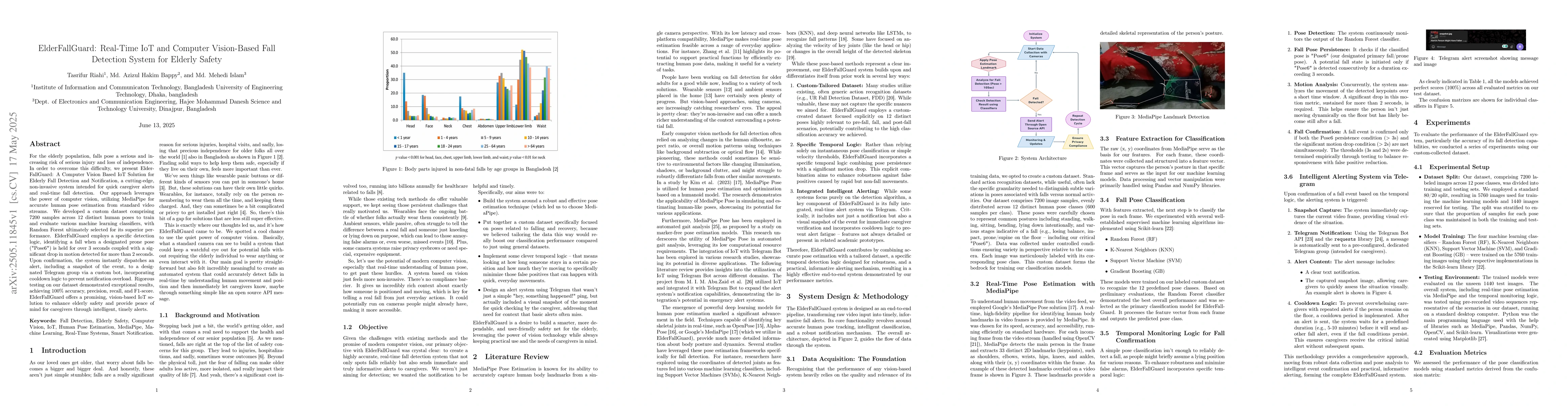 The research methodology involves developing ElderFallGuard, a fall detection system for the elderly using computer vision and IoT. It leverages MediaPipe for human pose estimation and a custom dataset of 7200 samples across 12 poses to train and evaluate machine learning classifiers, with Random Forest chosen for its performance. The system identifies falls via specific poses and motion changes, triggering alerts via a Telegram bot.