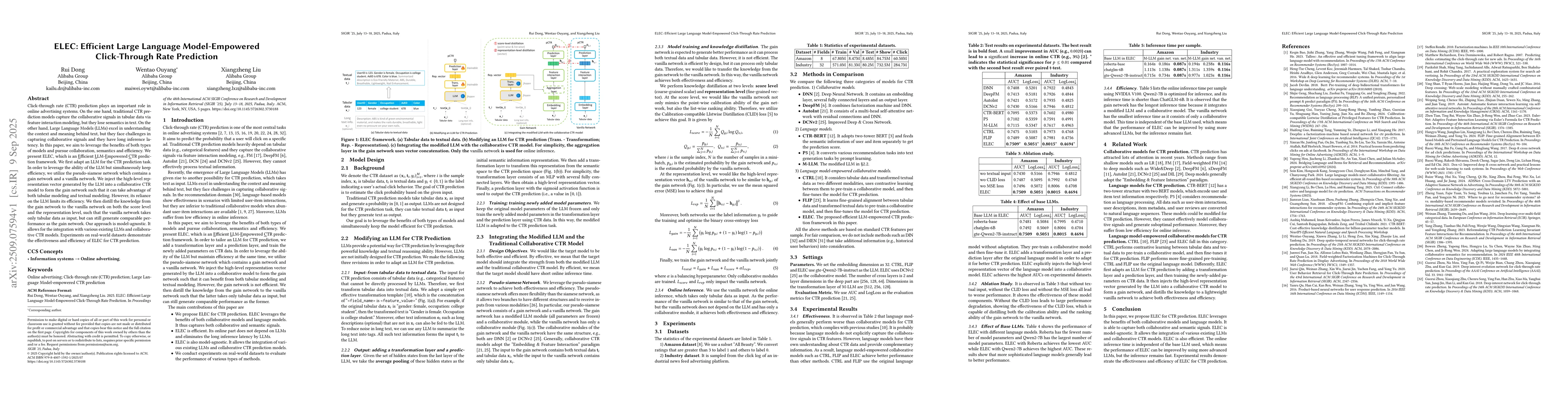 Click-through rate (CTR) prediction plays an important role in online advertising systems. On the one hand, traditional CTR prediction models capture the collaborative signals in tabular data via feature interaction modeling, but they lose semantics in text. On the other hand, Large Language Models (LLMs) excel in understanding the context and meaning behind text, but they face challenges in capturing collaborative signals and they have long inference latency. In this paper, we aim to leverage the benefits of both types of models and pursue collaboration, semantics and efficiency. We present ELEC, which is an Efficient LLM-Empowered CTR prediction framework. We first adapt an LLM for the CTR prediction task. In order to leverage the ability of the LLM but simultaneously keep efficiency, we utilize the pseudo-siamese network which contains a gain network and a vanilla network. We inject the high-level representation vector generated by the LLM into a collaborative CTR model to form the gain network such that it can take advantage of both tabular modeling and textual modeling. However, its reliance on the LLM limits its efficiency. We then distill the knowledge from the gain network to the vanilla network on both the score level and the representation level, such that the vanilla network takes only tabular data as input, but can still generate comparable performance as the gain network. Our approach is model-agnostic. It allows for the integration with various existing LLMs and collaborative CTR models. Experiments on real-world datasets demonstrate the effectiveness and efficiency of ELEC for CTR prediction.