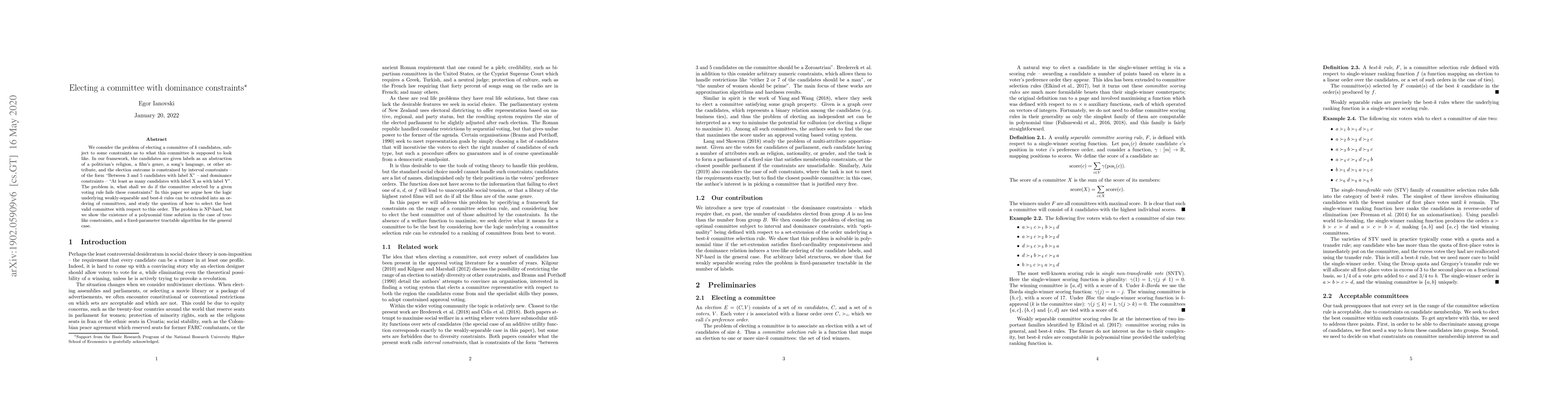 This paper explores the problem of electing a committee under dominance constraints and interval requirements, proposing extensions of weakly-separable and best-$k$ rules to order valid committees. It presents a polynomial time solution for tree-like constraints and a fixed-parameter tractable algorithm for general cases, despite the problem's NP-hard nature.