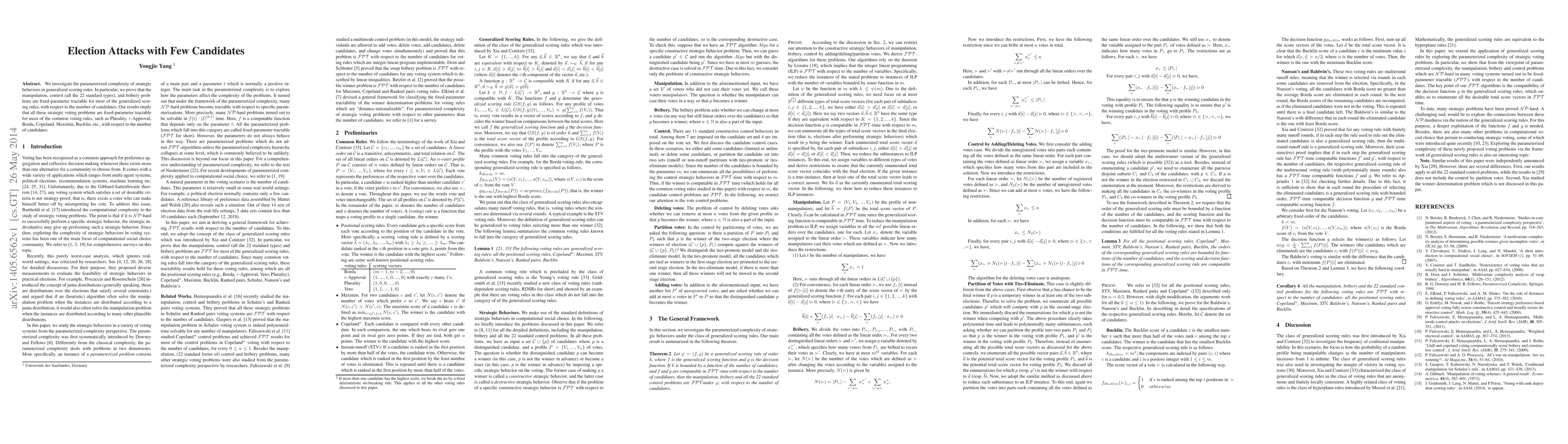 We investigate the parameterized complexity of strategic behaviors in generalized scoring rules. In particular, we prove that the manipulation, control (all the 22 standard types), and bribery problems are fixed-parameter tractable for most of the generalized scoring rules, with respect to the number of candidates. Our results imply that all these strategic voting problems are fixed-parameter tractable for most of the common voting rules, such as Plurality, r-Approval, Borda, Copeland, Maximin, Bucklin, etc., with respect to the number of candidates.