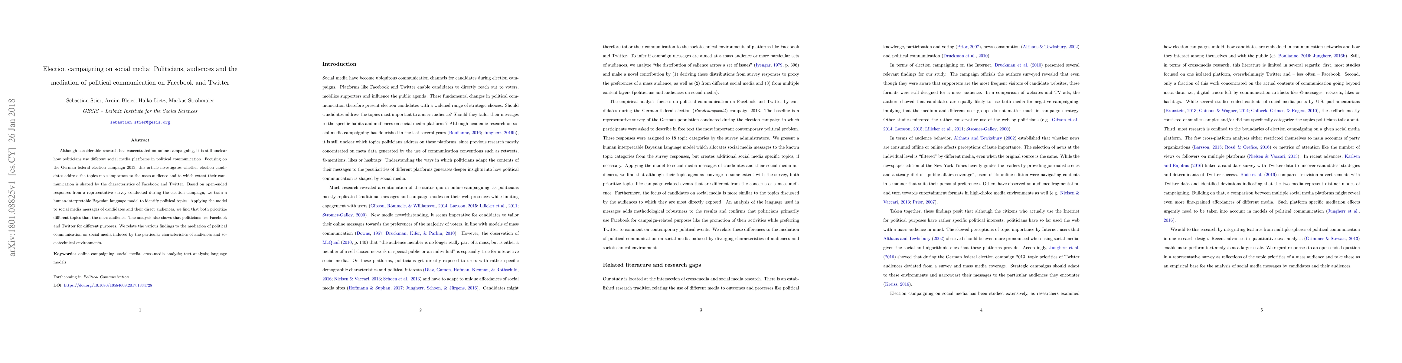 This study examines the German federal election campaign of 2013 to determine how politicians utilize Facebook and Twitter for political communication. It finds that candidates and their audiences prioritize different topics than the general public, and the platforms serve distinct purposes in their communication strategies.