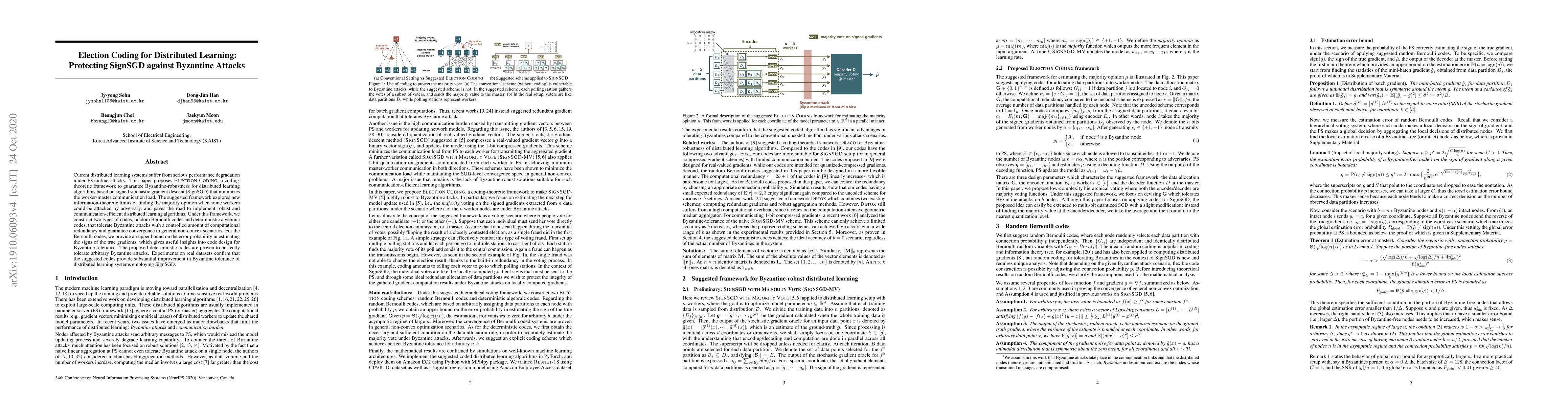 This paper proposes Election Coding to enhance the Byzantine-robustness of SignSGD in distributed learning, employing Majority Vote with minimal communication. It introduces two types of codes—random Bernoulli and deterministic algebraic—that tolerate Byzantine attacks with controlled computational redundancy, validated by deep learning experiments on Amazon EC2.