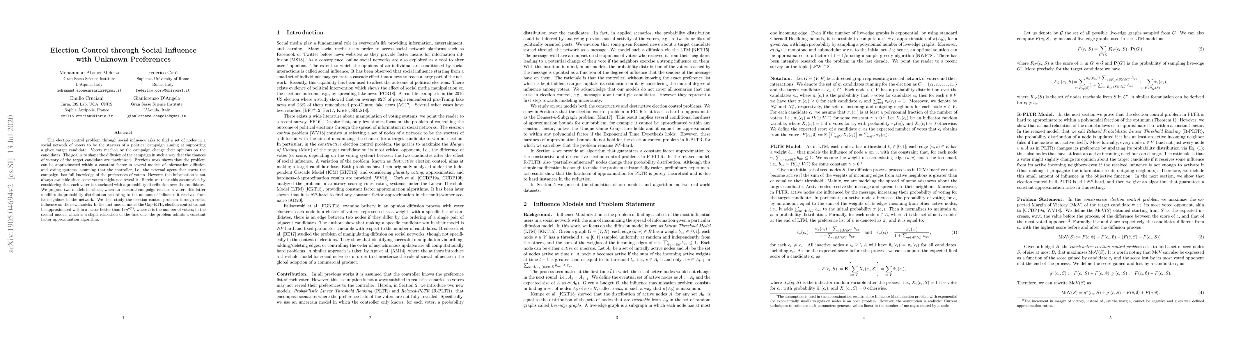 Researchers developed new models to control elections through social influence without knowing voters' preferences, finding that one model offers a constant-factor approximation algorithm while the other has limitations.